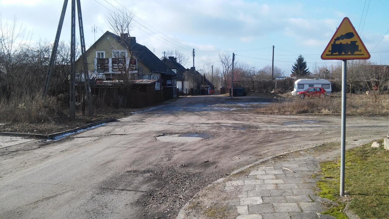 Okolice ulicy Stawowej. Tor szedł (idzie) pomiędzy słupem trójnożnym a budynkami..