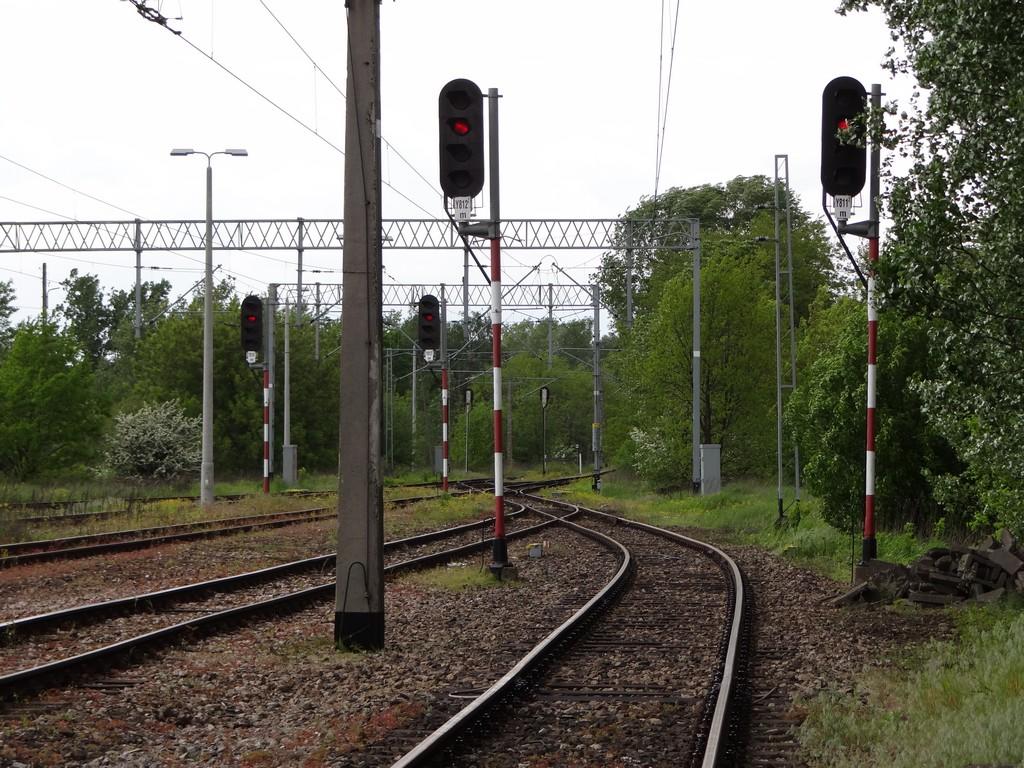 Stacja kolejowa Elektrociepłowni Żerań. Widoczne wszystkie cztery semafory wyjazdowe. Cztery tory główne o długości użytkowej ok. 840 m, 790 m, 800 m i 800 m (po prawej), tor odstawczy o długości użytkowej ok. 70 m (w oddali po lewej), trzy tory zdawczo-odbiorcze bocznicy skupu złomu o długości użytkowej ok. 500 m, 470 m i 510 m (po lewej poza kadrem). Widok w kierunku Legionowa. 13,1 km.