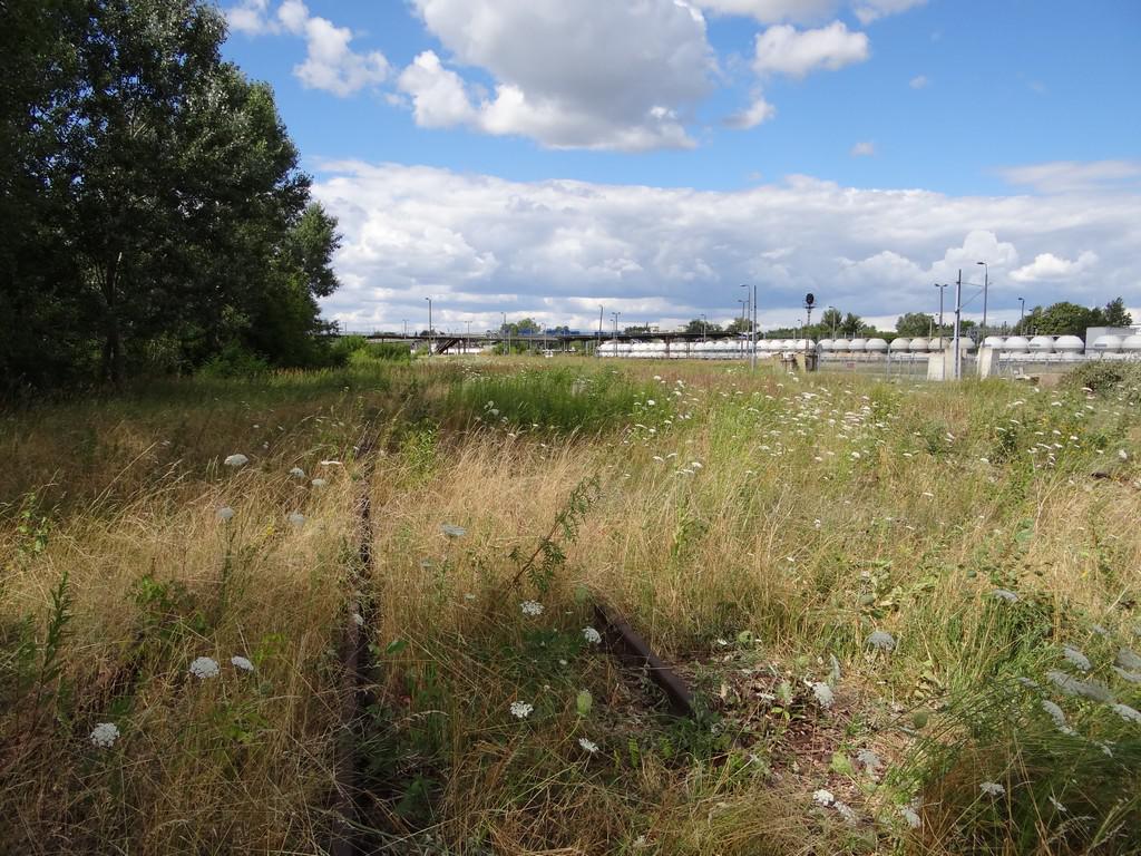 Teren, który już dawno nie pełni kolejowej funkcji i torowisko jest częściowo zajęte przez firmy. Razem z fragmentem wykorzystywanym przez bocznicę kolejowej bazy materiałowej przy ulicy Golędzinowskiej 25 (po prawej) były tu cztery tory zdawczo-odbiorcze o długości użytkowej ok. 510 m każdy, tor ładunkowy przy placu ładunkowym o długości ok. 510 m, tor komunikacyjny, bocznica do magazynu przy ulicy Golędzinowskiej (chyba 31) oraz zlikwidowany już najbardziej na południe wysunięty wjazd na bocznicę fabryki samochodów. Widok w kierunku Legionowa. 9,7 km/13,9 km.