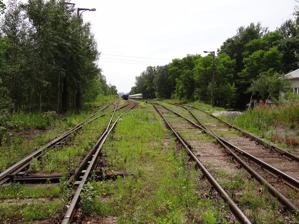 Po lewej pięć torów zdawczo-odbiorczych o długości użytkowej ok. 770 m, 750 m, 730 m, 700 m i 700 m, z tyłu tor wyciągowy o długości użytkowej ok. 320 m, po prawej tor bocznicy cementowni i zakładów farmaceutycznych. Po prawej budynek mieszkalny na ternie kolejowym. Widok w kierunku Warszawy Gdańskiej i Warszawy Wschodniej. 15,8 km.