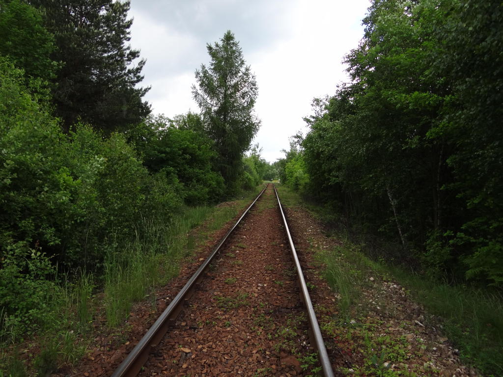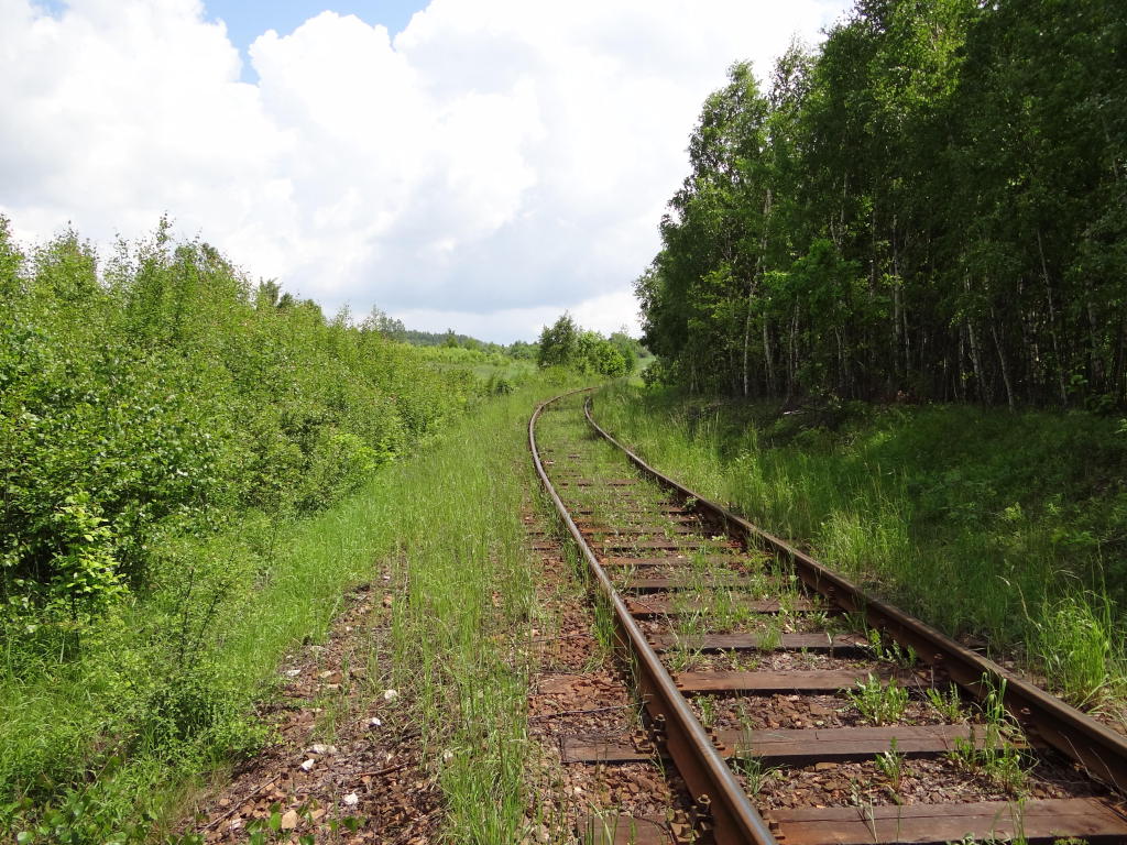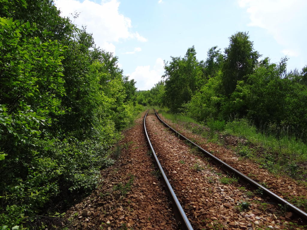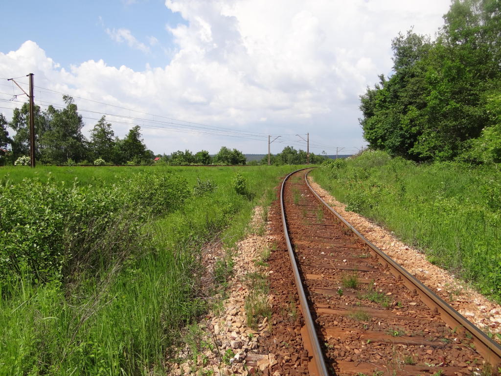 Najostrzejszy łuk linii o promieniu ok. 280 m. Widok w kierunku zakładu produkcji kruszywa. 1,5 km.