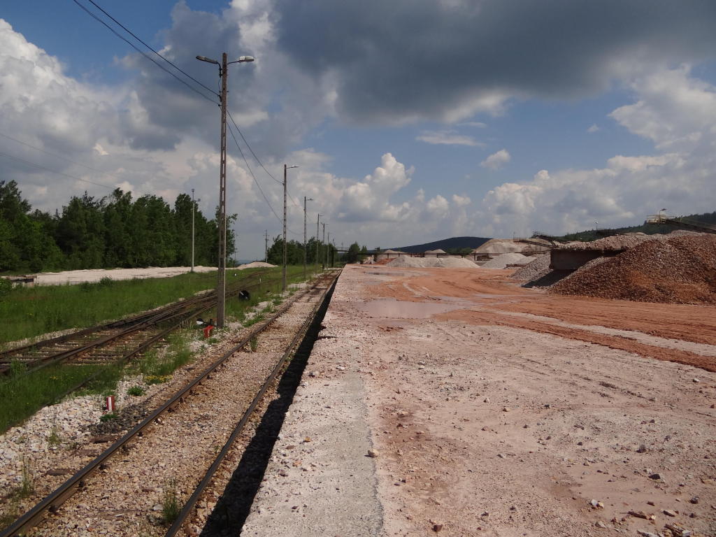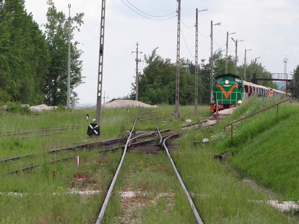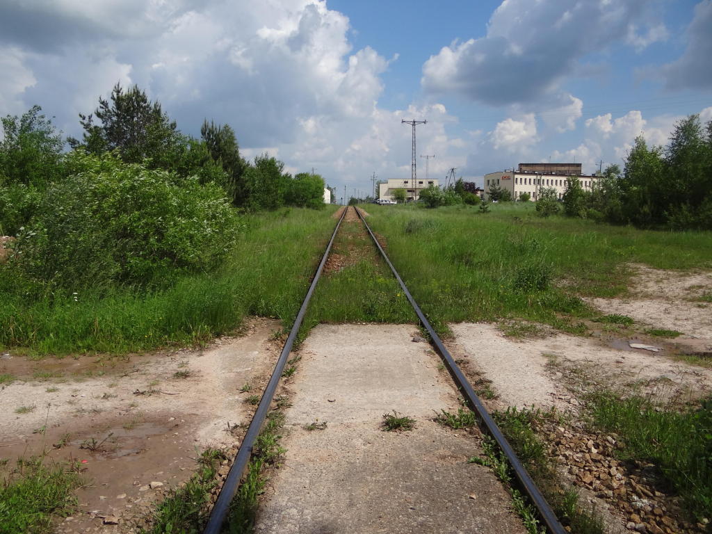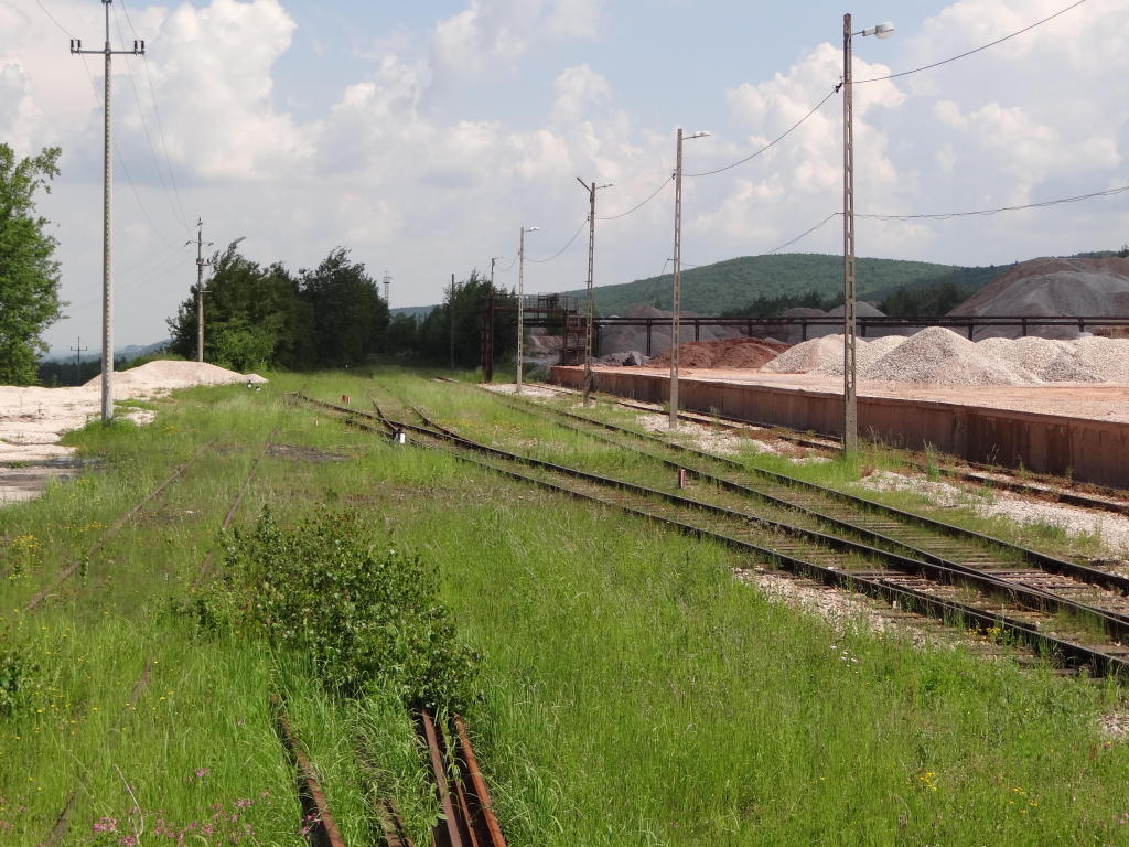 Kamieniołom Bukowa Góra. Zachodnia głowica rozjazdowa. Rampa boczna o długości ok. 180 m. Po prawej zakład produkcji kruszywa. PCC Silicium S.A. działa na rynku kamieni budowlanych i drogowych, eksploatuje złoże udostępnione w 1974 roku. Widok w kierunku końca linii, zakładu produkcji kruszywa. 2,6 km.