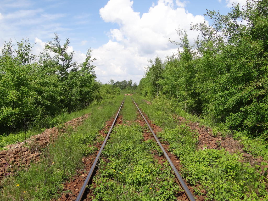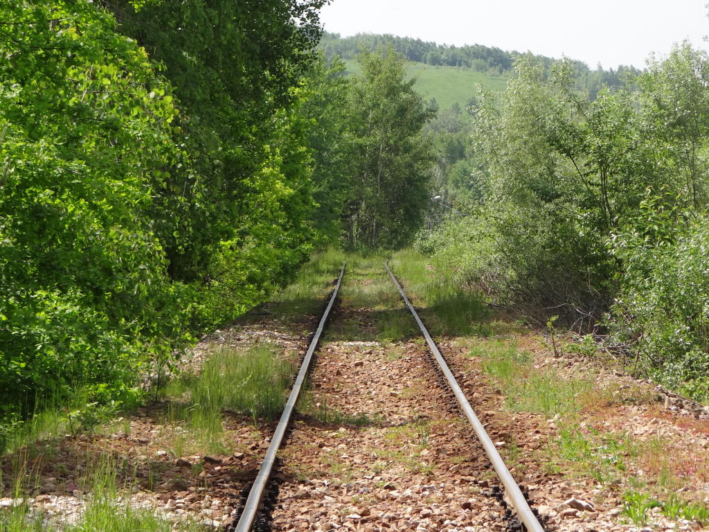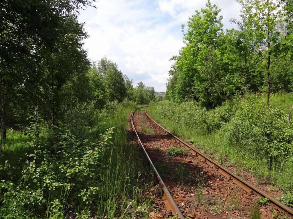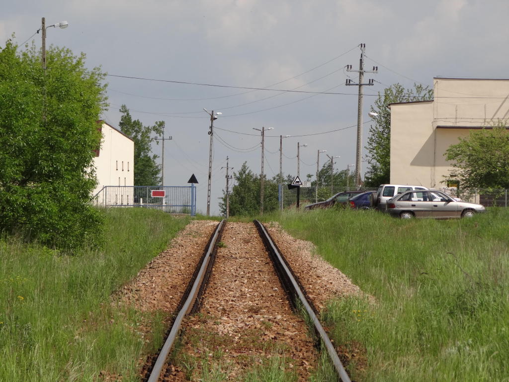 Kamieniołom Bukowa Góra. Zachodnia głowica rozjazdowa. Rampa boczna o długości ok. 180 m. Po prawej zakład produkcji kruszywa. PCC Silicium S.A. działa na rynku kamieni budowlanych i drogowych, eksploatuje złoże udostępnione w 1974 roku. Widok w kierunku końca linii, zakładu produkcji kruszywa. 2,6 km.