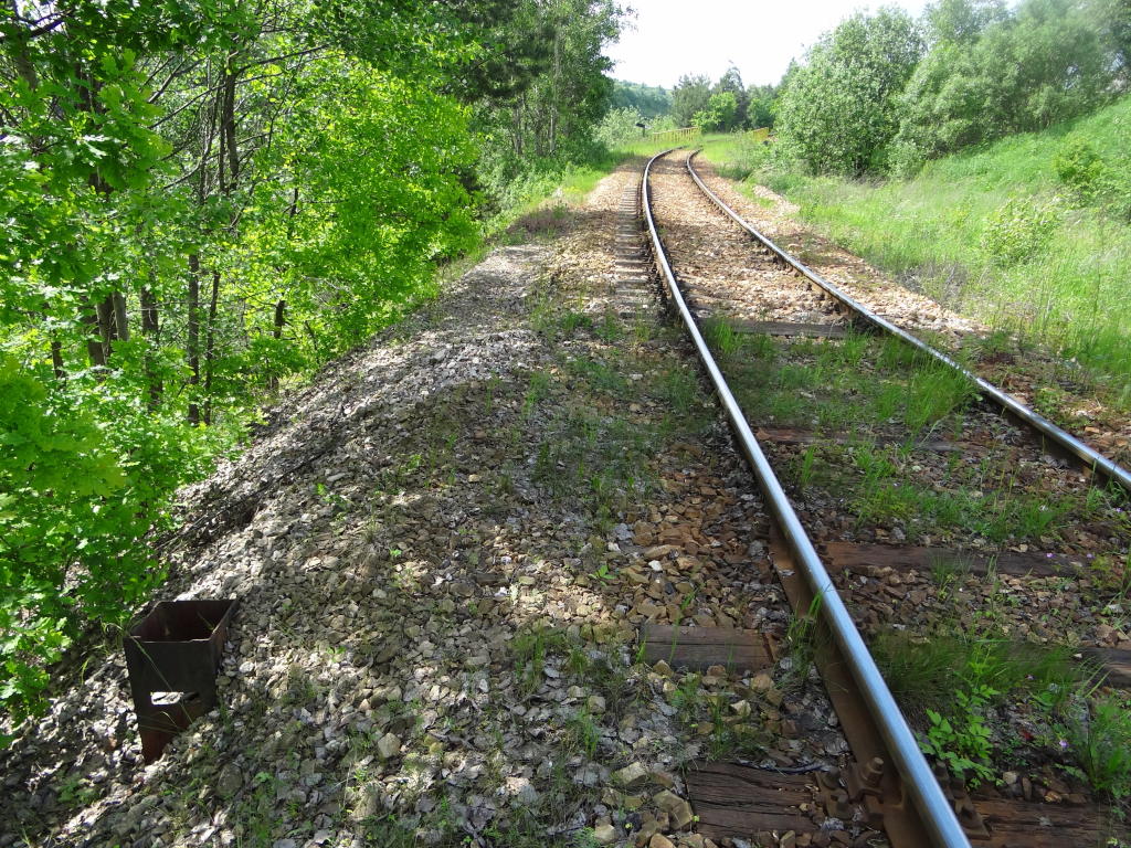 Kamieniołom Bukowa Góra. Zachodnia głowica rozjazdowa. Po prawej rampa boczna o długości ok. 180 m. Po lewej poza kadrem lokomotywownia. Widok w kierunku końca linii, zakładu produkcji kruszywa. 2,6 km.