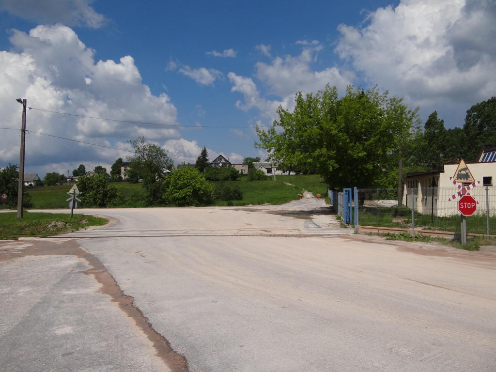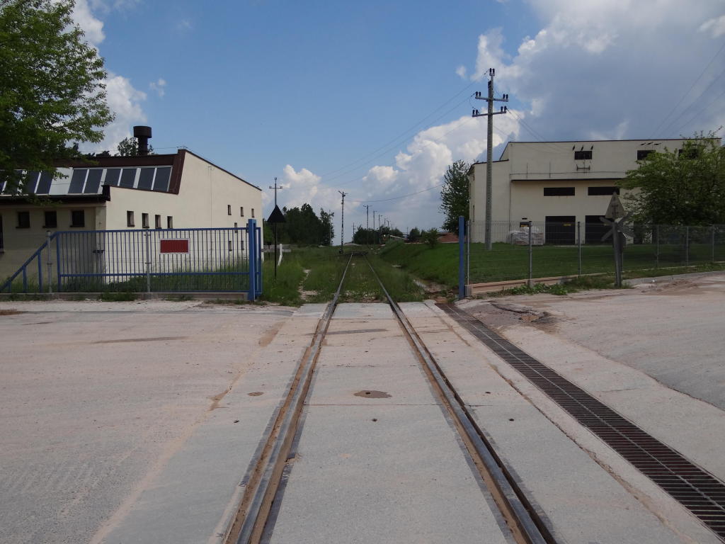 Przejazd drogowy w Zagórzu. W prawo stacja Łączna, w lewo zakład produkcji kruszywa. 2,3 km.