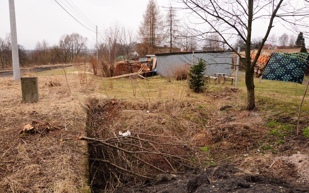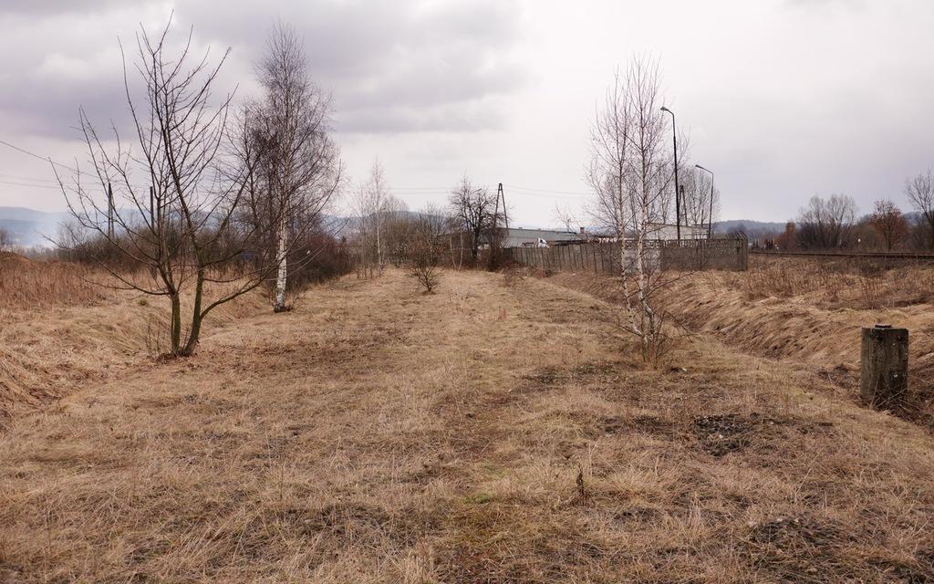 Pozostałości torowiska na terenie górnego zakładu, położonego bliżej Wojborza. Ta część jest obecnie zamieszkała (obiekty na wprost) oraz służy celom gospodarczym (obiekty po stronie lewej). Widok w kierunku południowo-zachodnim.
