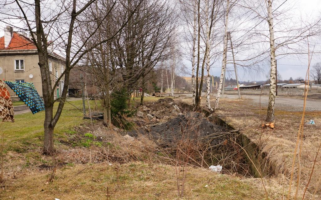 Bocznica do Młynowa, Ścinawica. Z prawej widoczne zakłady przemysłowe. Torowisko biegło niegdyś zapewne i do nich, jednak obserwacja nie dostarczyła niezbitych dowodów na to. Podążam więc dalej przez wykop, który stał się miejscem składowania przeróżnych odpadów. Z prawej widoczna rampa załadunkowa. Widok w kierunku Młynowa.