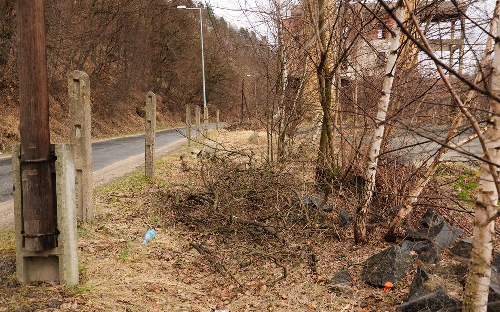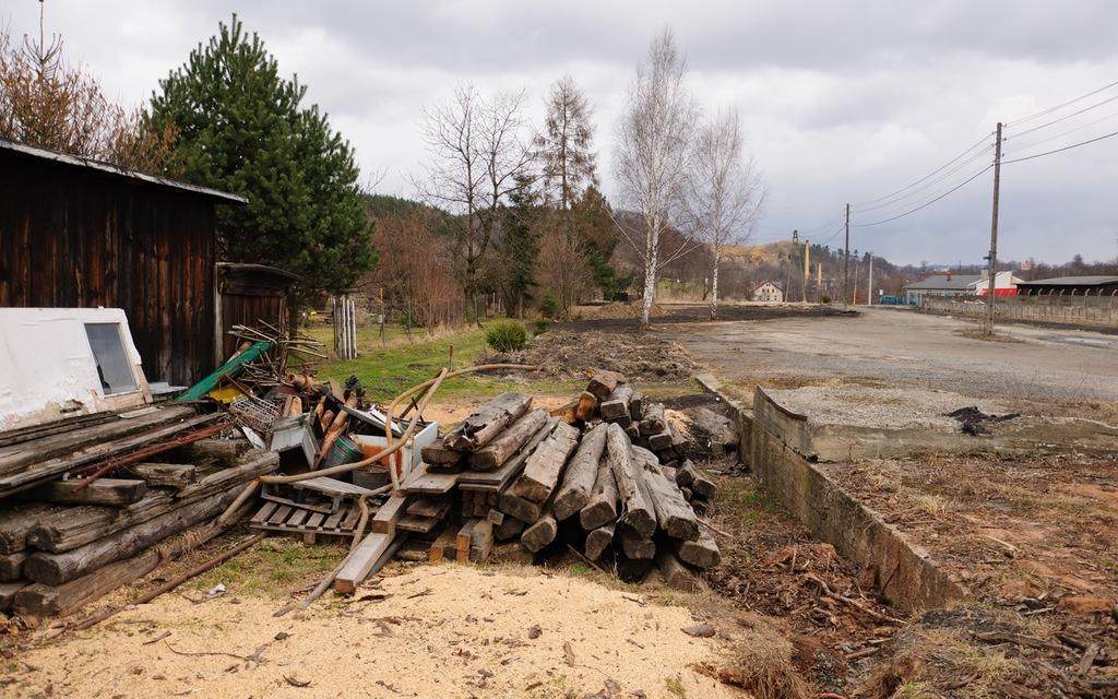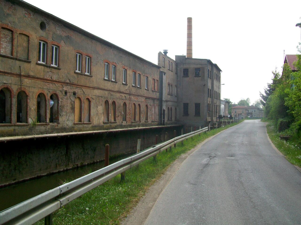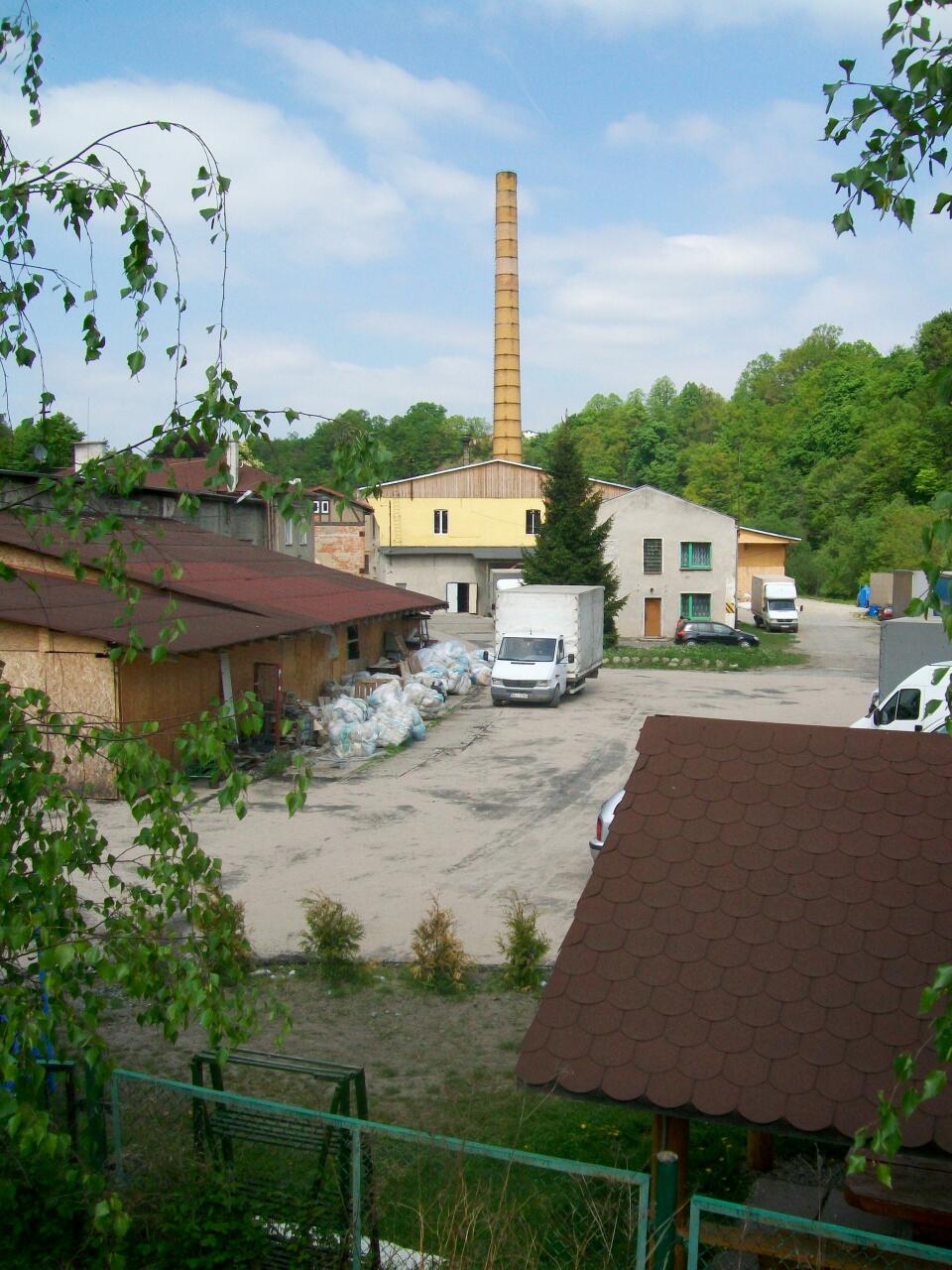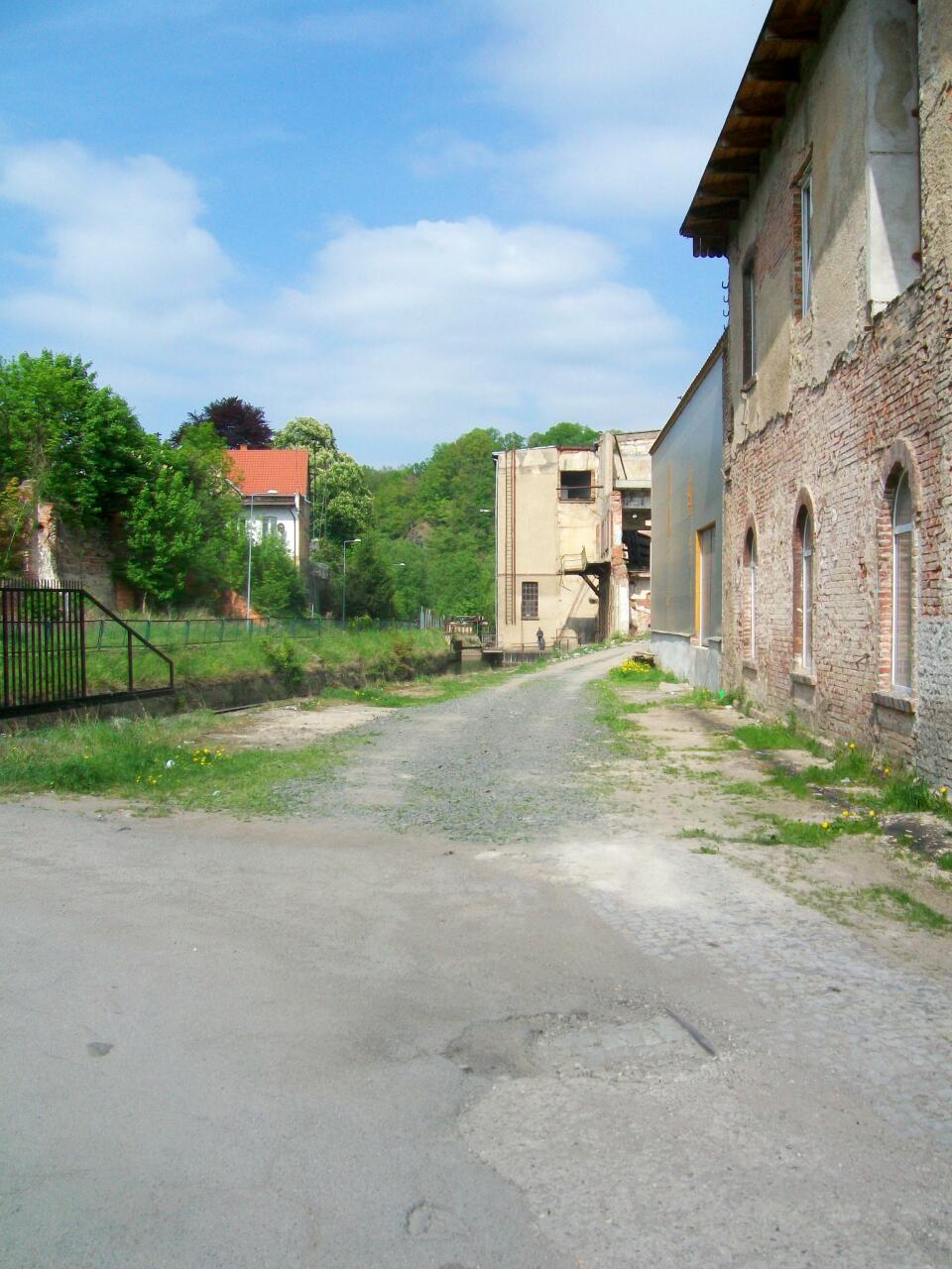 Pozostałości torowiska na terenie górnego zakładu, położonego bliżej Wojborza. Ta część jest obecnie zamieszkała (obiekty po lewej stronie) oraz służy celom gospodarczym (obiekty po stronie prawej i na wprost). W tle wysoki komin należący do zrujnowanej części zakładu. Widok w kierunku północno-wschodnim.