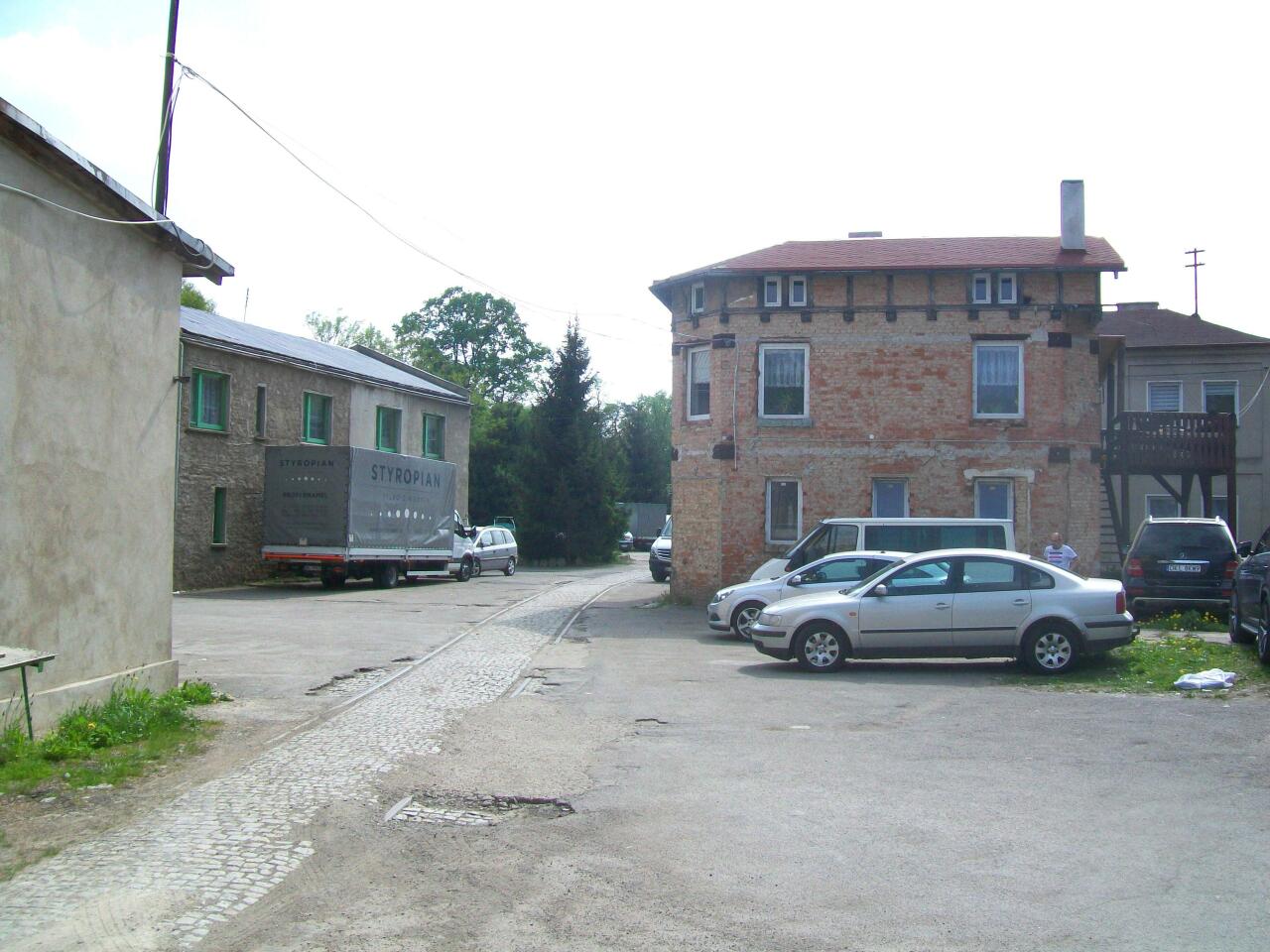 W tym miejscu widocznym dokładnie na wprost kończyła się bocznica towarowa. Widok od strony ulicy.