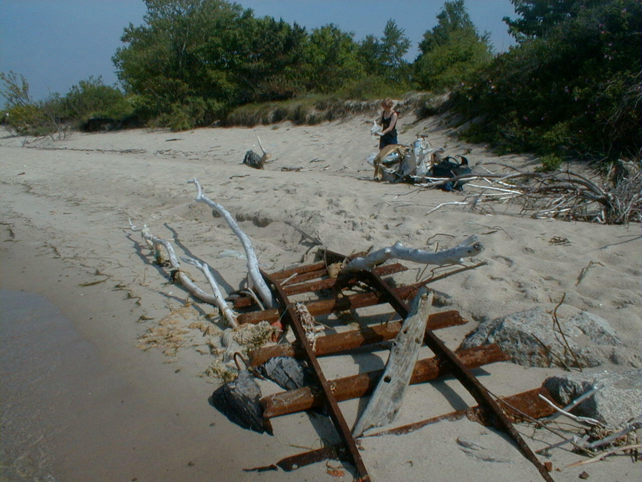 Przęsło patentowe na plaży od strony zatoki, kilkaset metrów przed końcem półwyspu, tuż obok ruin Stanowiska ogniowego nr 1 31. Baterii Artylerii Nadbrzeżnej.