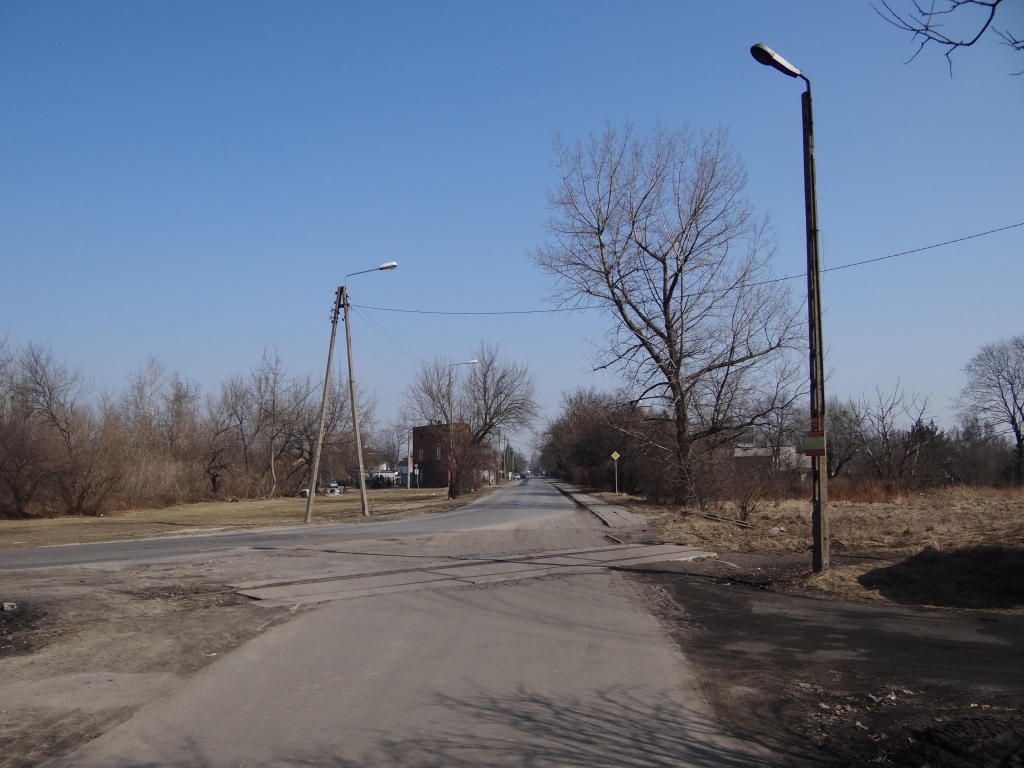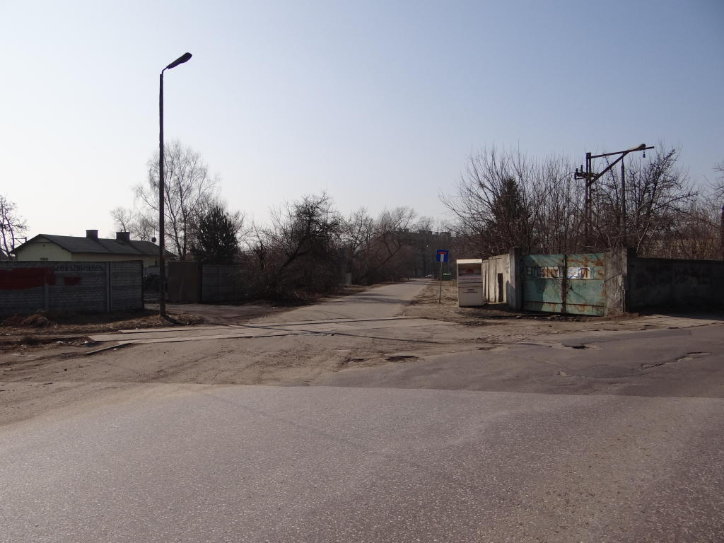 Bocznica Zakładów Naprawczych Taboru Kolejowego. Przejazd drogowy w ciągu ulicy Warszawskiej. Widok w kierunku Warszawy. 13,7 km.