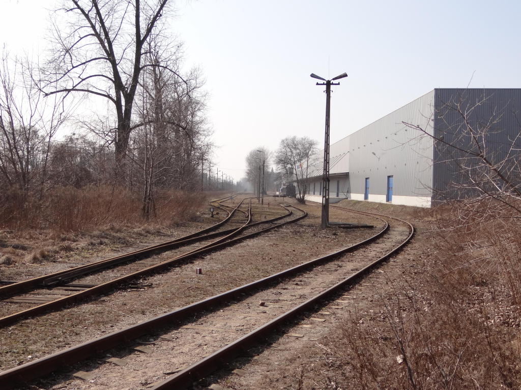 Bocznica Centrum Logistycznego. Po prawej poza kadrem magazyn o powierzchni zabudowy ok. 6500 mkw. z rampą kolejową o długości ok. 30 m. Na wprost historyczna hala o powierzchni zabudowy ok. 8000 mkw. z jednym torem kolejowym o długości użytkowej ok. 130 m. Widok w kierunku Grodziska Mazowieckiego. 14,4 km.