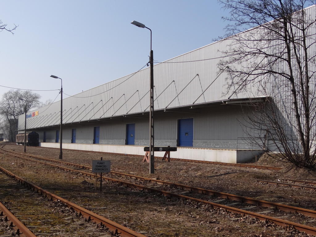 Bocznica Centrum Logistycznego. Historyczna hala o powierzchni zabudowy ok. 8000 mkw. z jednym torem kolejowym o długości użytkowej ok. 130 m. Widok w kierunku Warszawy. 14,6 km.
