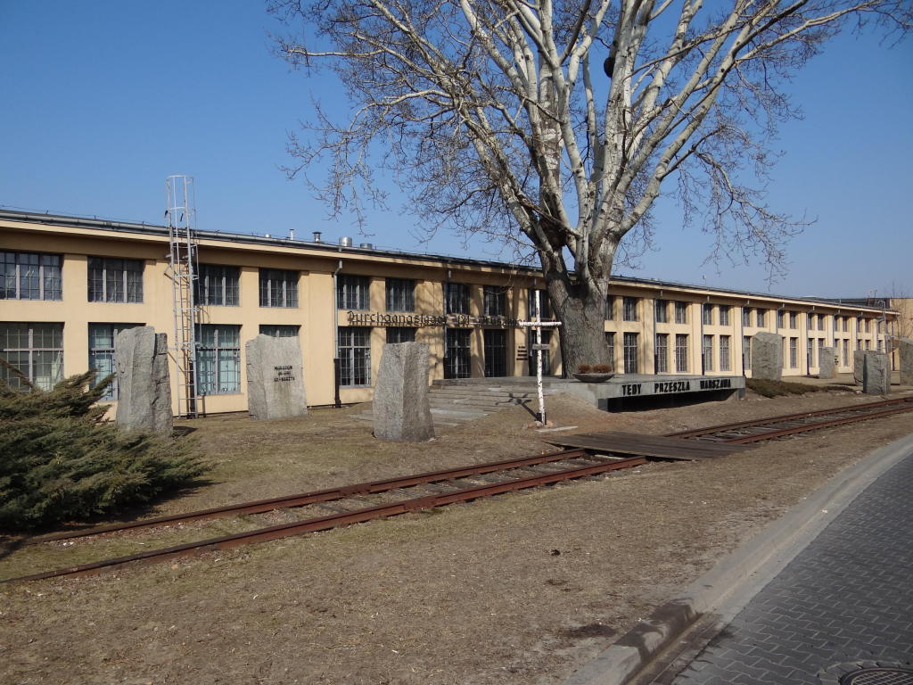 Pomnik. Muzeum Durchgangslager 121 Pruszków. Obóz funkcjonował na terenie Zakładów Naprawczych Taboru Kolejowego od 6-08-1944 do 16-01-1945. Po lewej historyczna hala warsztatowa o powierzchni zabudowy ok. 25.000 mkw. Widok w kierunku Warszawy. 14,8 km.