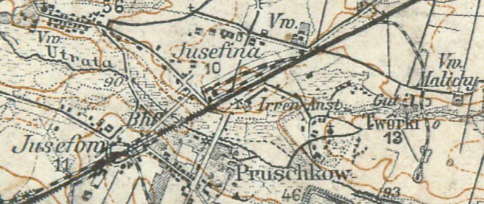 Fragment mapy niemieckiej z roku 1911, przerysowującej wcześniejszą mapę rosyjską. Widoczna bocznica do Tworek.