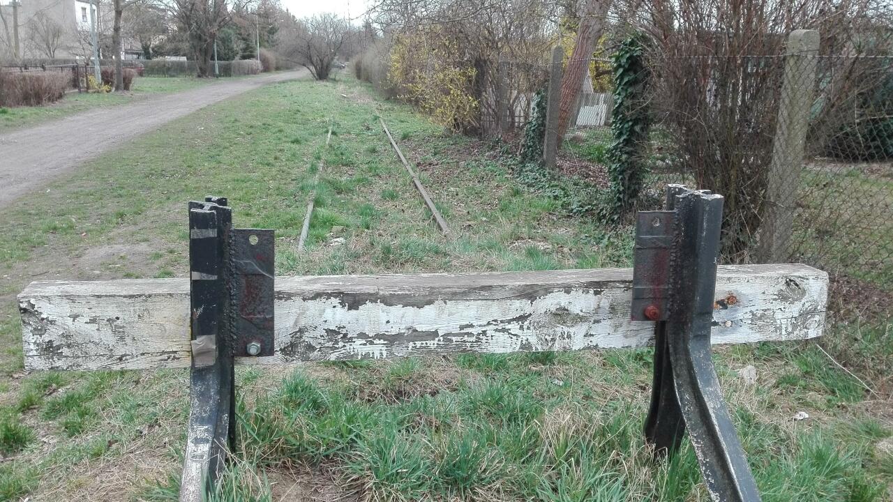 Koniec toru i kozioł oporowy bocznicy do wzm. Zdjęcie zrobione przy ogródkach działkowych na ul.5 stycznia w kierunku wschodnim.