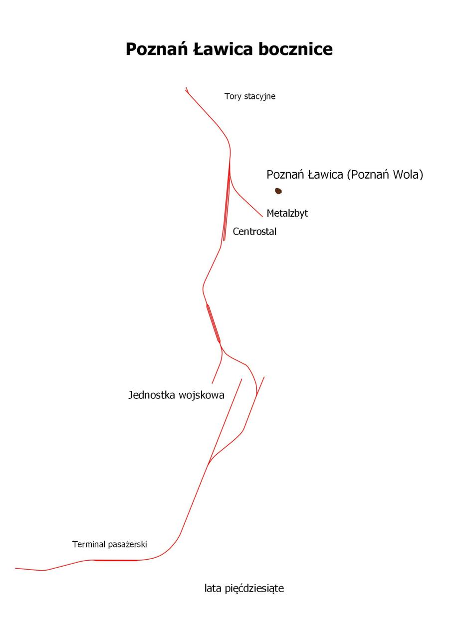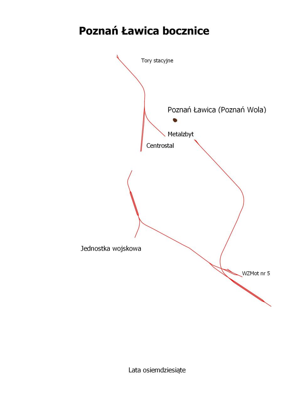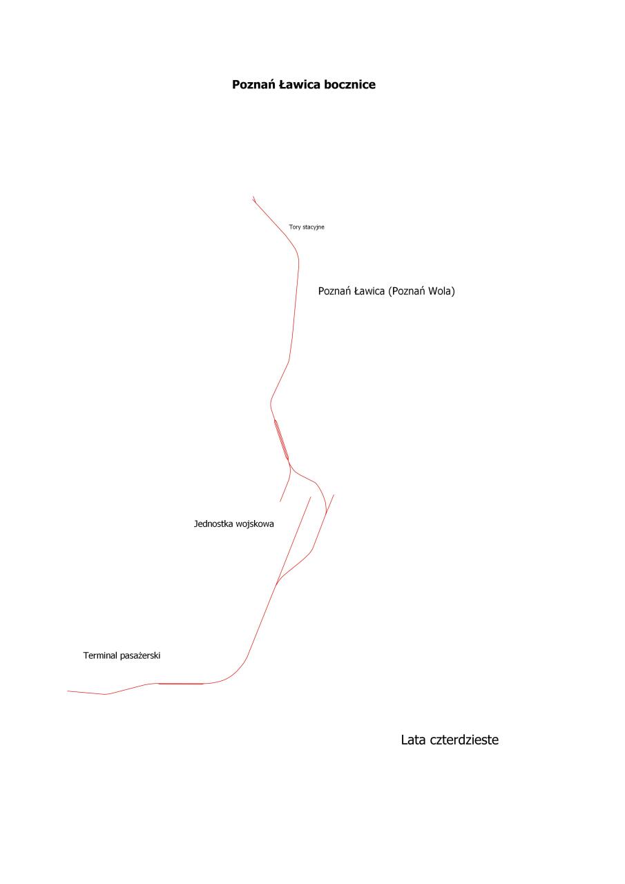 Pierwsza bocznica prowadziła ze stacji Poznań Ławica do nowo powstałego lotniska na Ławicy i zapewniała obsługę stacjonujących tam żołnierzy. Wg wszystkich planów posiadała niewielką trzy torową stację ładunkową położoną w centralnej części jednostki choć jeżeli porównamy ze zdjęciami musiało być tak jeszcze 'coś' - niestety, na razie nie mam dostępu do archiwum a internet nie podsuwa rozwiązania.