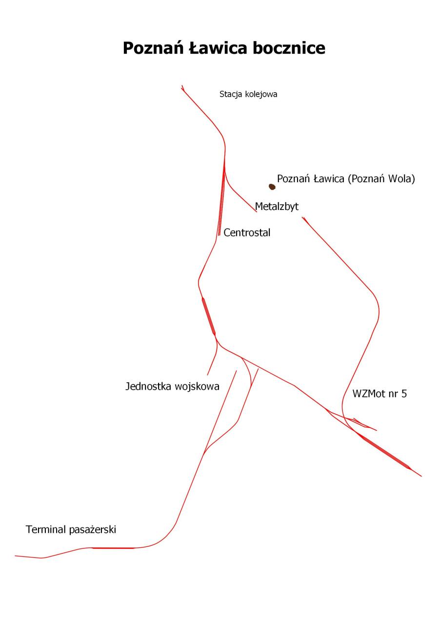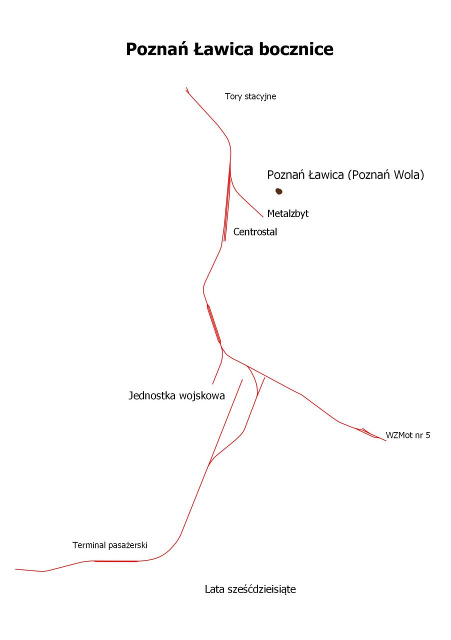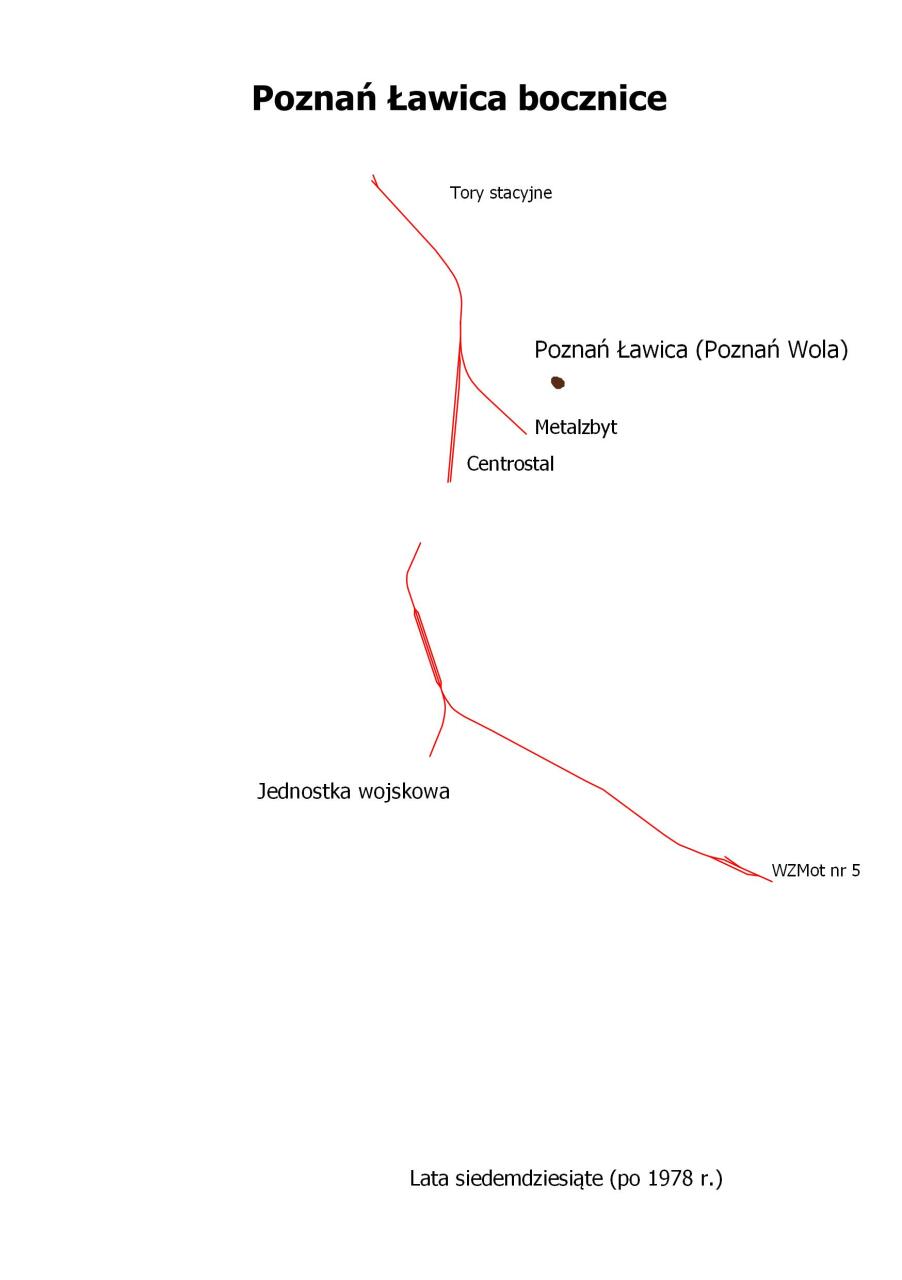 Pierwsza bocznica prowadziła ze stacji Poznań Ławica do nowo powstałego lotniska na Ławicy i zapewniała obsługę stacjonujących tam żołnierzy. Wg wszystkich planów posiadała niewielką trzy torową stację ładunkową położoną w centralnej części jednostki choć jeżeli porównamy ze zdjęciami musiało być tak jeszcze 'coś' - niestety, na razie nie mam dostępu do archiwum a internet nie podsuwa rozwiązania.