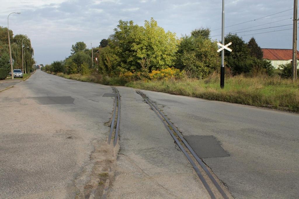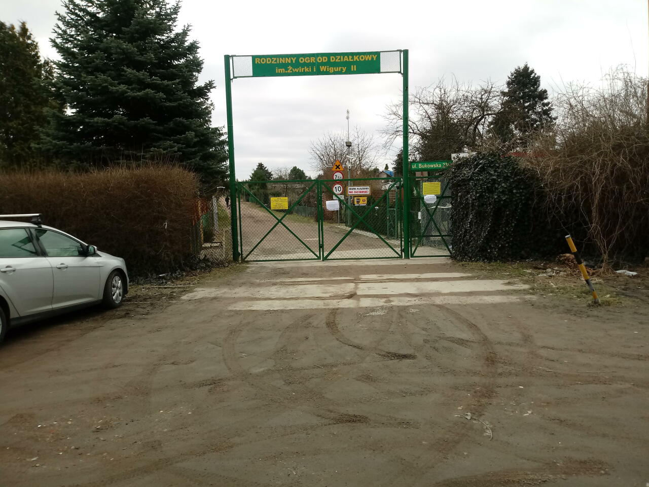 Tor przy wjeździe na teren ROD im. Żwirki i Wigury II w Poznaniu (okol. ul. Przelot). Na pierwszym planie, równolegle do toru, ul. 5 Stycznia.