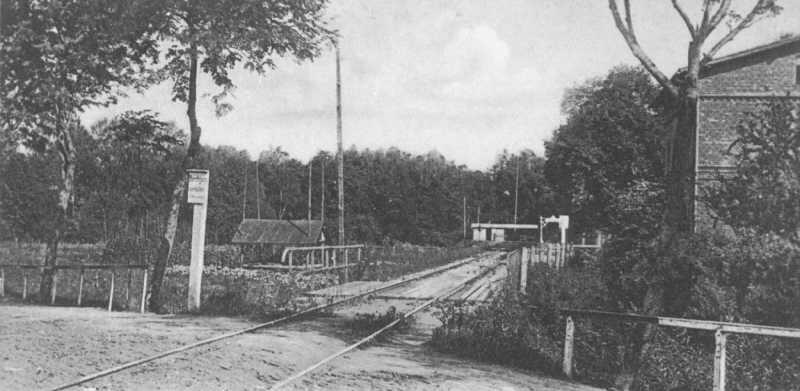 - stojącą za kozłami oporowymi poczekalnię (Warteraum der Haffuferbahn) z blachy falistej (Wellblech) - zapewne tą widoczną w dali, na powyższym c-b zdjęciu, być może po lewej (część zabudowana) znajdowała się kasa biletowa (?),