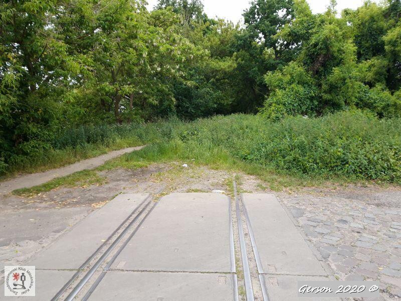 Zaasfaltowany przejazd na ul. Santockiej toru prowadzącego do bocznicy jednostki wojskowej, a w przeszłości również do bocznic Samopomocy Chłopskiej, CPN i W.P.B.