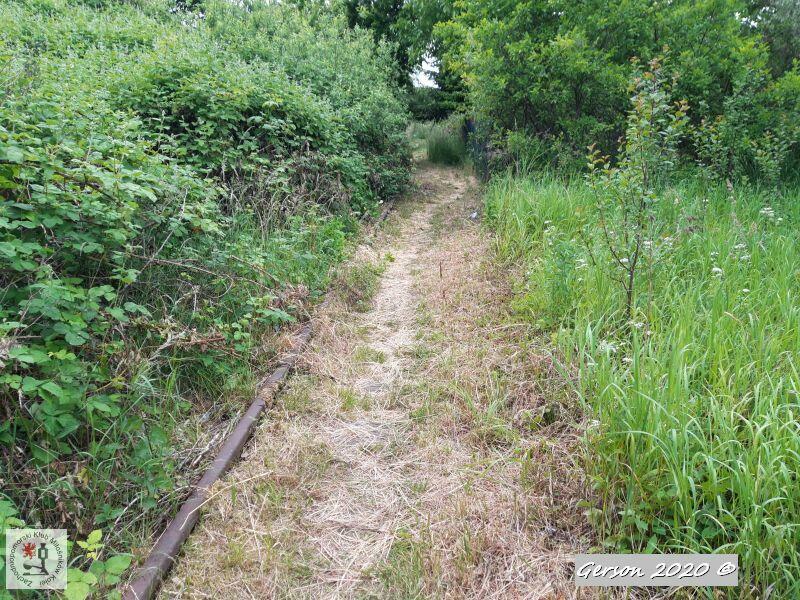 Ścieżka wydeptana przez mieszkańców pobliskiego osiedla. Zarośnięty tor znajduje po prawej stronie. Widok w kierunku ul. Santockiej i jednostki wojskowej.