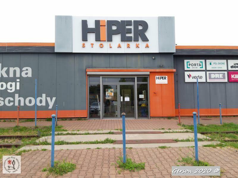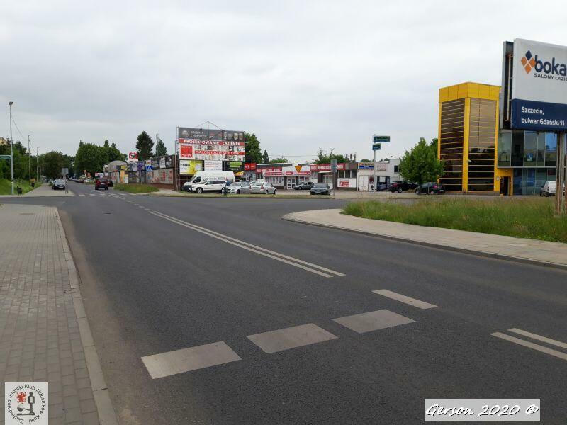 Przejście dla pieszych z parkingu do hurtowni Hiper Glazur (po lewej stronie). Widok w kierunku ul. Santockiej. Bocznica jednostki znajduje się z tyłu.