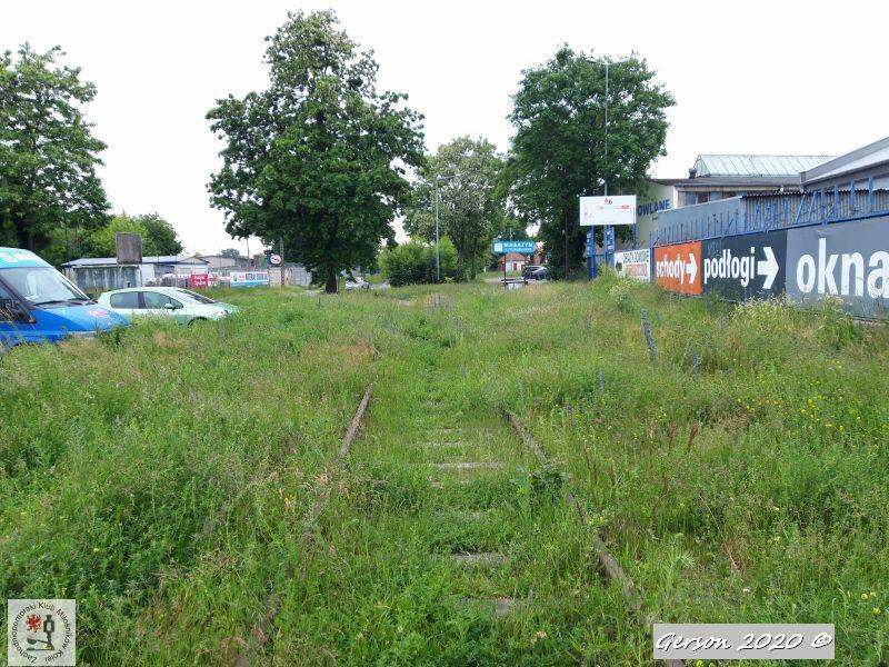 Zarośnięta równia stacyjna, na której znajdowały się trzy tory zdawczo - odbiorcze (o numerach: 1b, 2b i 3b). Istniejący tor przebiega śladem toru 1b. Tory 2b i 3b znajdowały się po prawej stronie. Widok w kierunku ul. Santockej i dalej jednostki wojskowej.