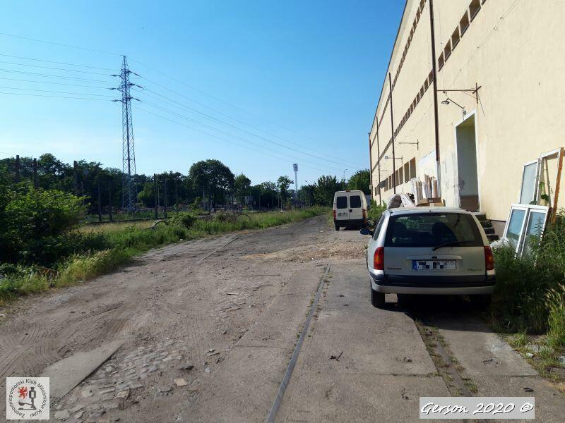 Zlikwidowana jednotorowa bocznica znajdująca się z tyłu magazynu należącego obecnie do hurtowni budowlanej Hiper-Glazur.
