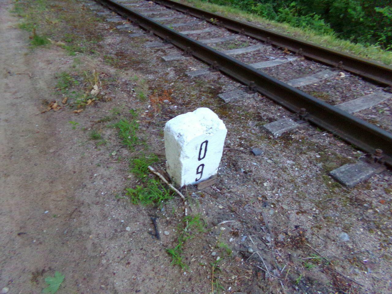 Słupek hektometryczny na torze bocznicowym w pobliżu rozjazdu bocznicy do stacji elektroenergetycznej.