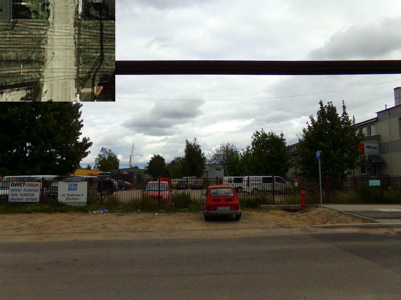 Widok w kierunku wschodnim (Olsztyn Główny) na nieistniejący przejazd na ulicy Stalowej. W rogu fragment fotomapy z 1995 roku z widocznym przejazdem.