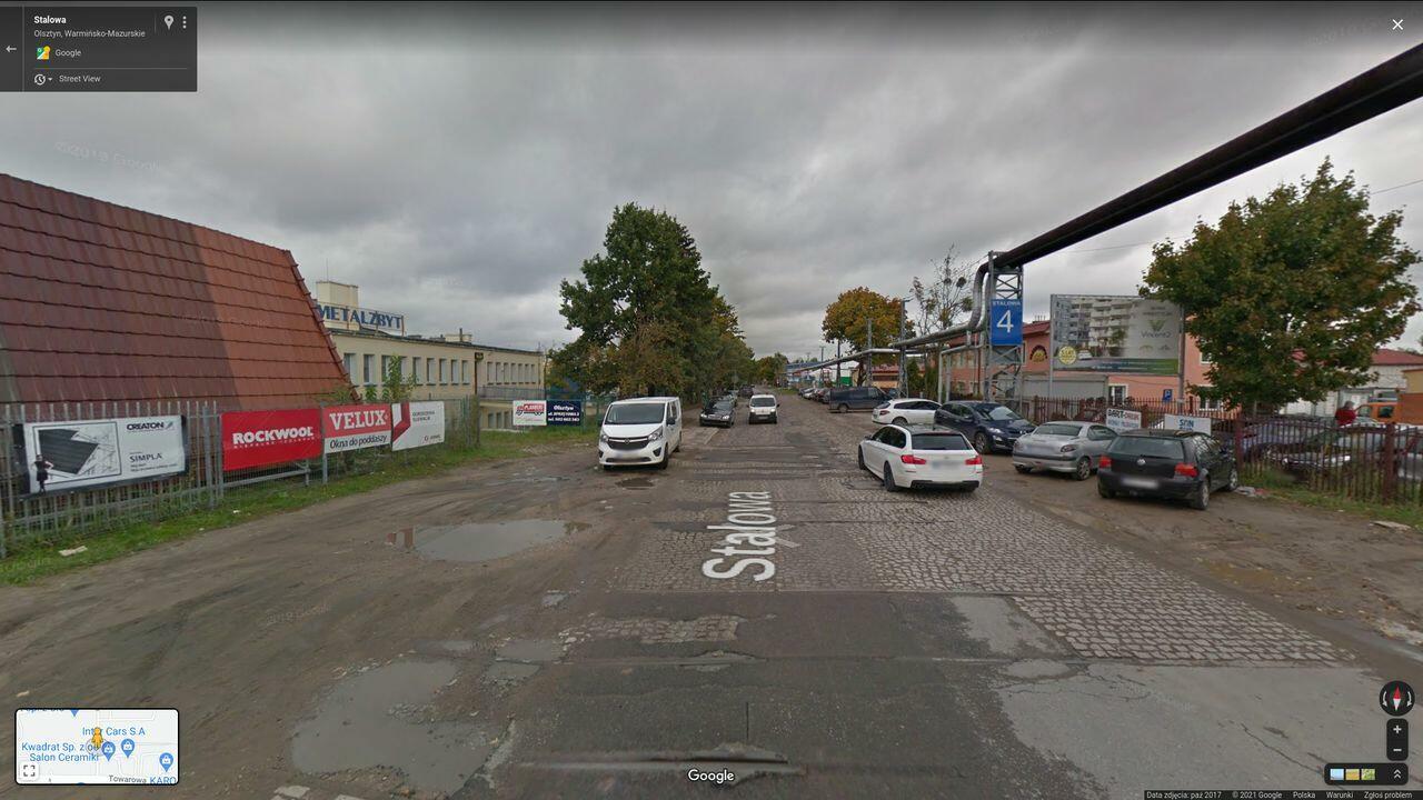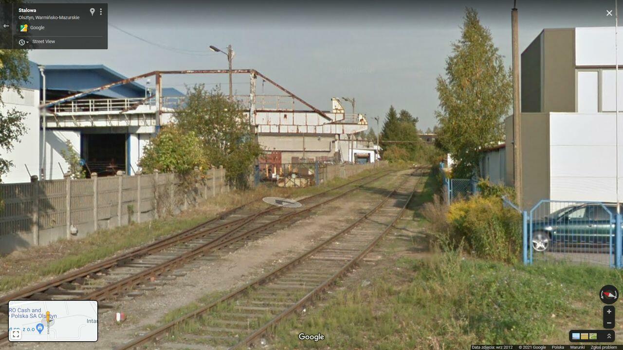 Zrzut ekranu pokazujący istniejącą (2012.09) jeszcze wtedy bocznicę ArcelorMittal. Widok w kierunku wschodnim (Olsztyn Główny) z przejazdu kolejowego na ulicy Stalowej.