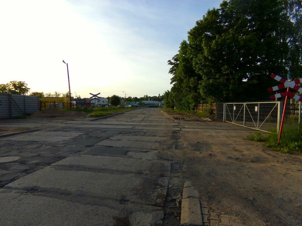 Przejazd na ulicy Trackiej. Widok w kierunku południowo - wschodnim. W lewo bocznica Michelina, cementowni, w prawo Olsztyn Główny.