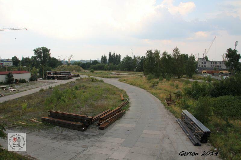 Widok z wiaduktu na ul. Druckiego - Lubeckiego w kierunku ul. Ludowej. Jeden z torów biegł po prawej stronie, wzdłuż drogi.
