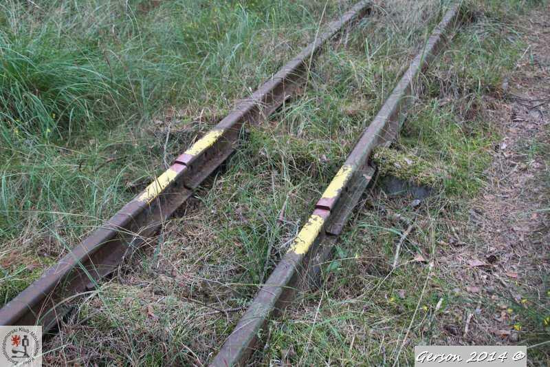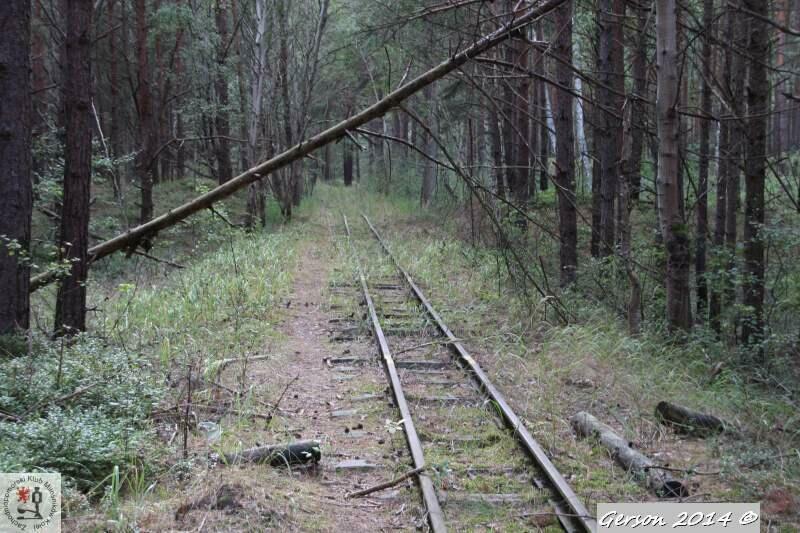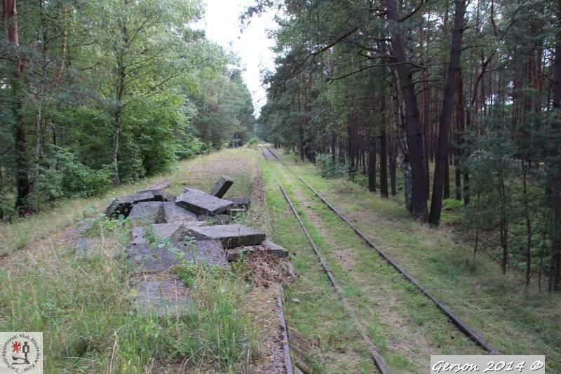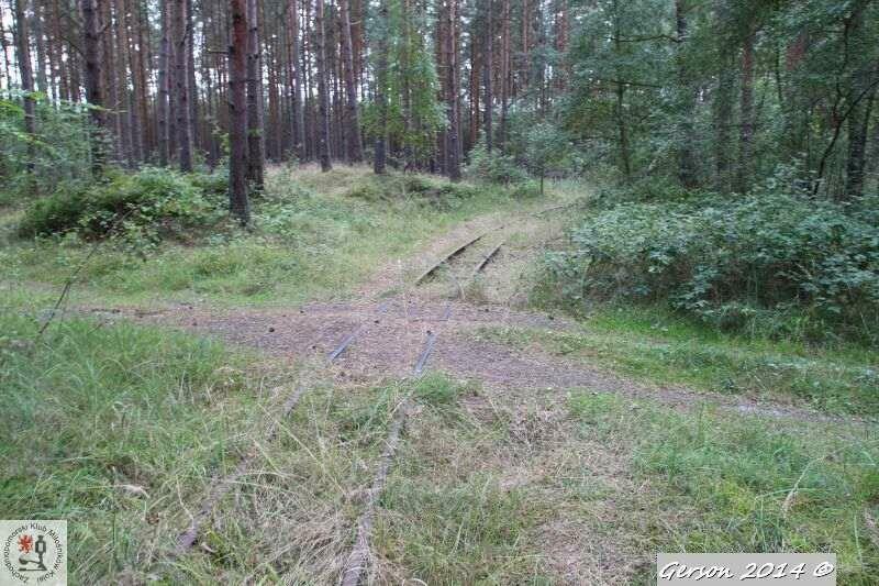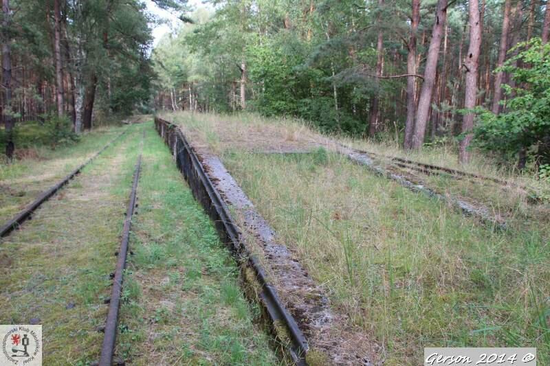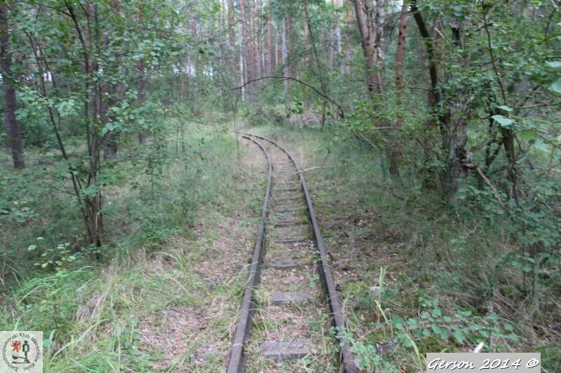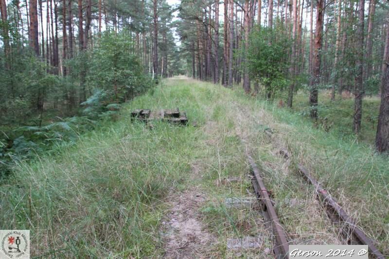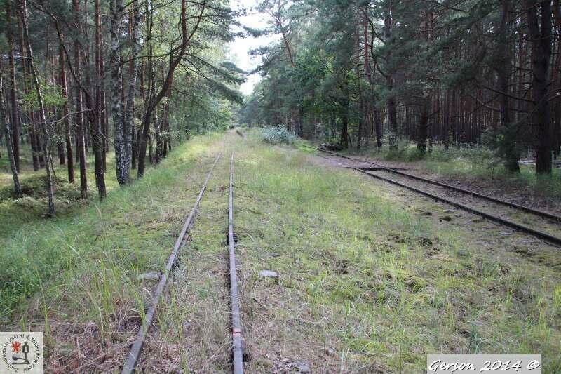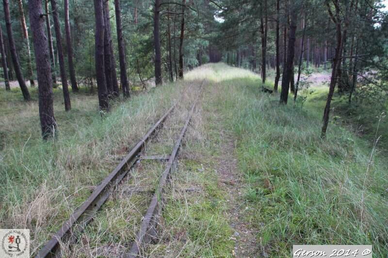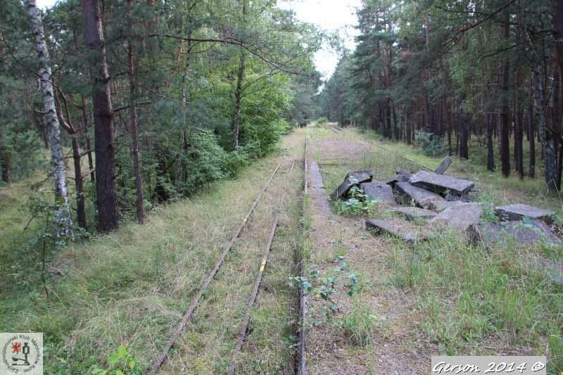 Zarośnięty tor kolei wąskotorowej. Po prawej dobrze zachowana bocznica normalnotorowa. Widok w kierunku magazynu broni (kolej wąskotorowa) i końca bocznicy (kolej normalnotorowa).