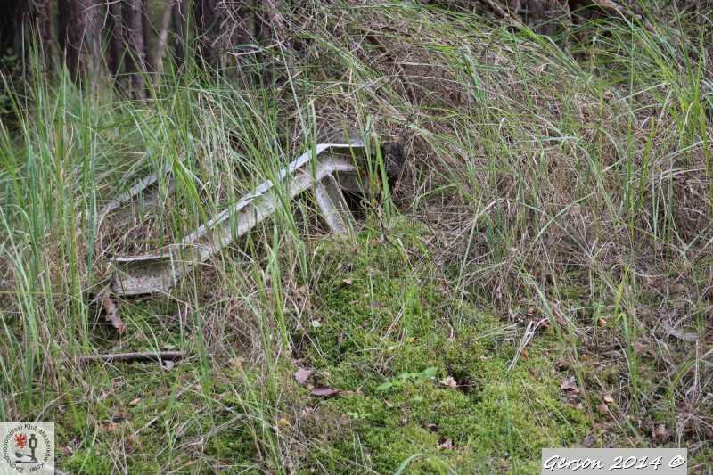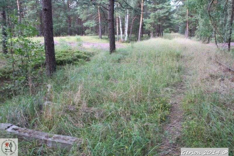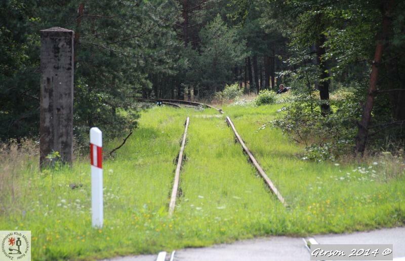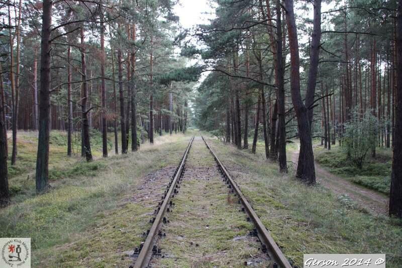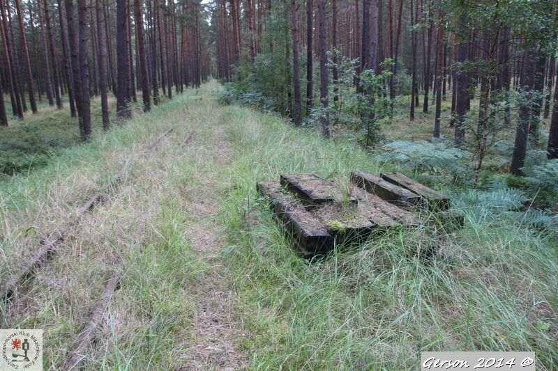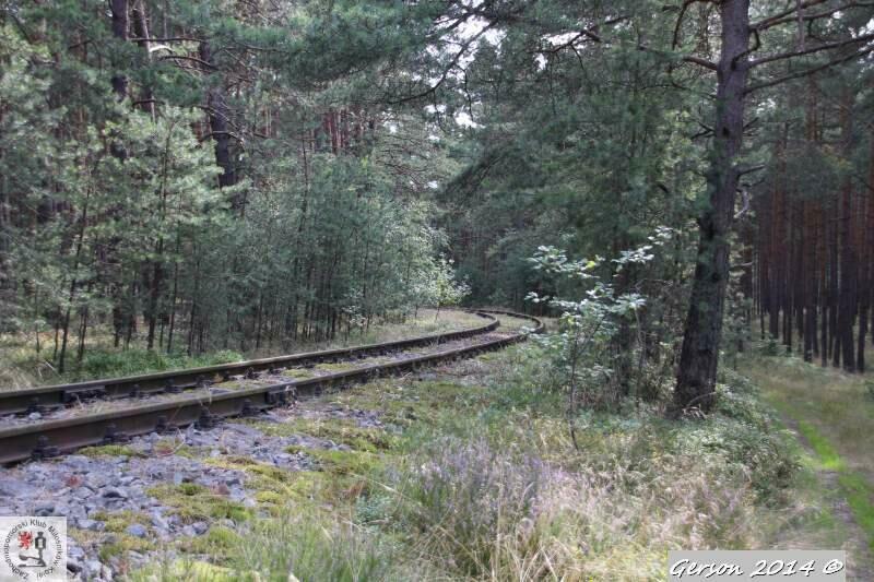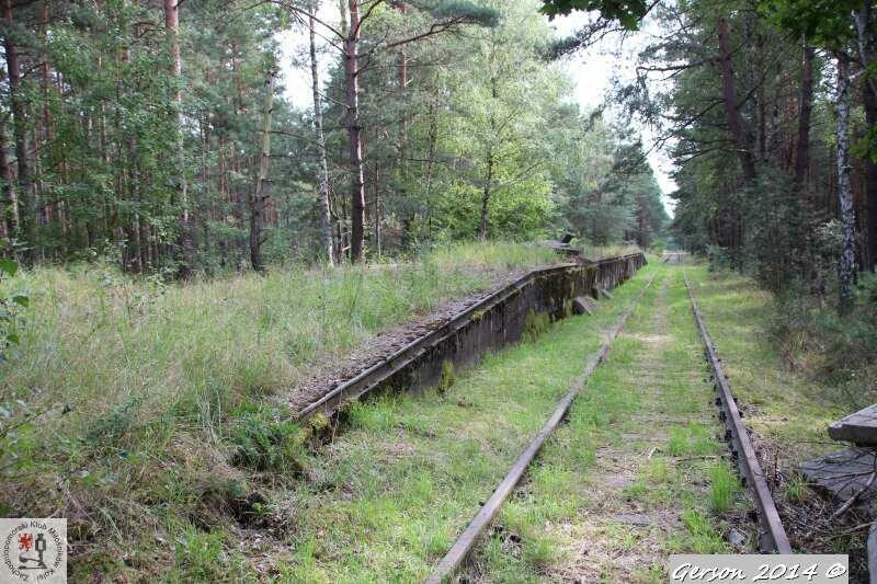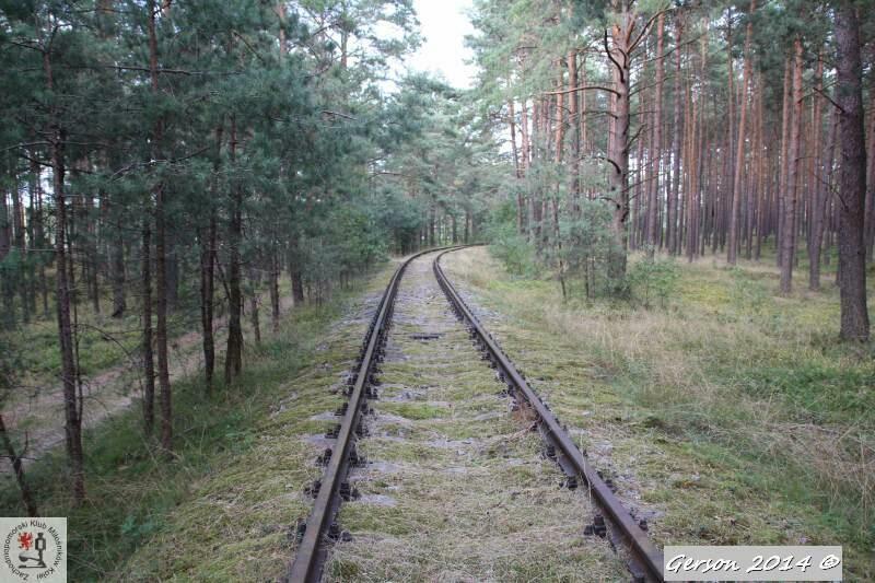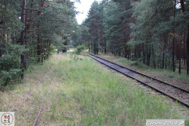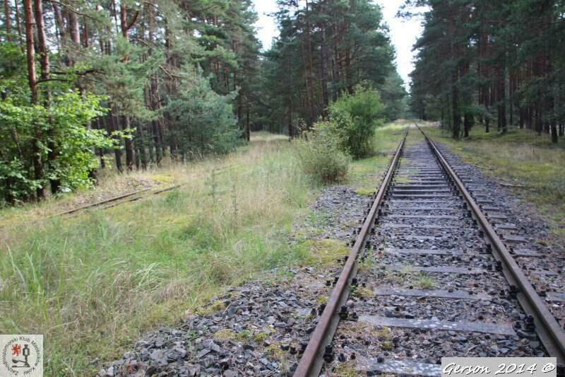 Zarośnięty tor kolei wąskotorowej. Po prawej dobrze zachowana bocznica normalnotorowa. Widok w kierunku magazynu broni (kolej wąskotorowa) i końca bocznicy (kolej normalnotorowa).