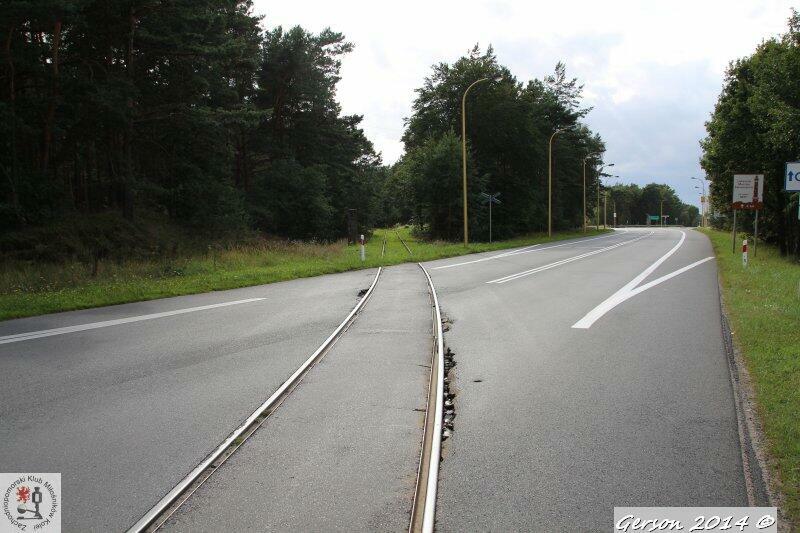 Widok z przejazdu kolejowego na DK3, na ul. Wolińskiej w Świnoujściu, w kierunku końca bocznicy normalnotorowej. Po lewej stronie widać zachowany słup bramy kolejowej.