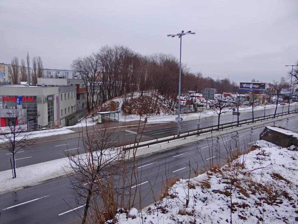 Zdjęcie widoku po pierwszym wiadukcie kolejowym. Widok ul. Grunwaldzkiej nad którym przebiegał w tym miejscu pierwszy wiadukt kolejowym za dworcem Wrzeszcz.