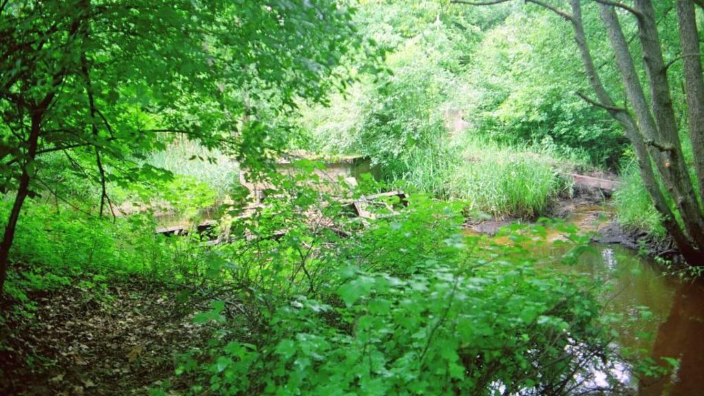 Ślady po moście nad jednym ze strumieni na odc. (most na Wołczenicy)-Trzechel, Trzechel na prawo, na lewym skraju zdjęcia - ślady pojazdu kołowego, który przejechał przez w tym miejscu teren bagnisty;
