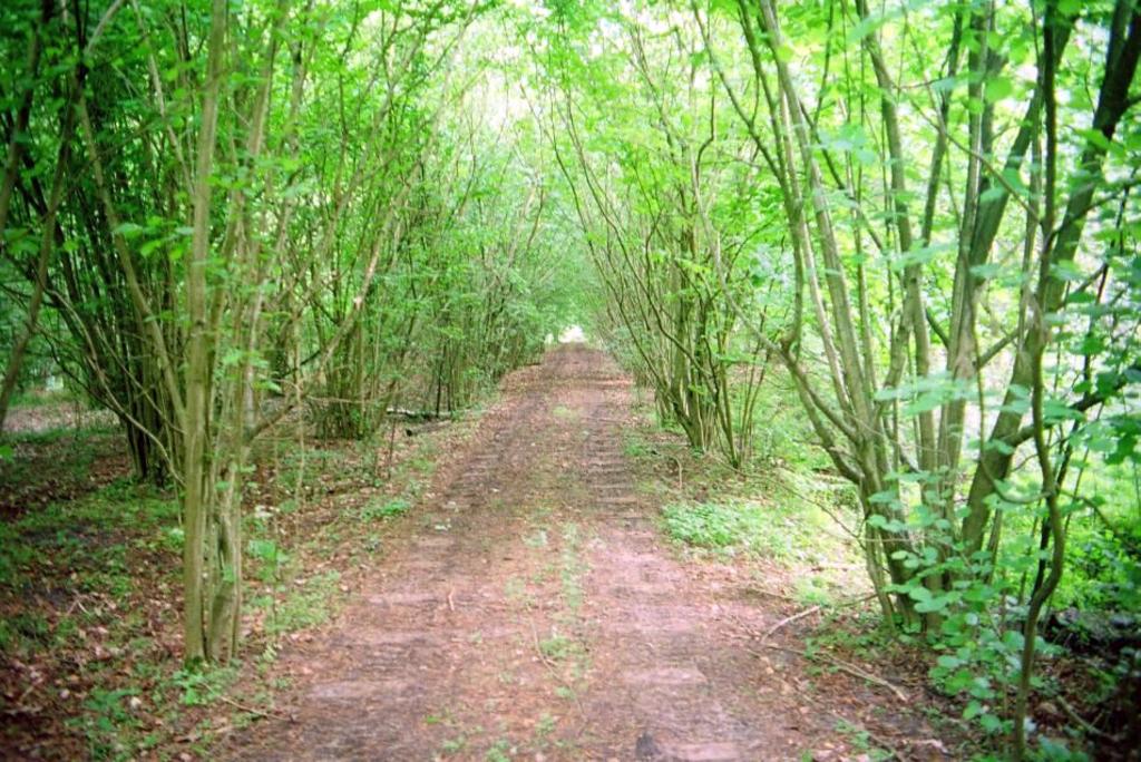Fragment szlaku - podkłady kolejowe, widok na odc. (most na Wołczenicy)-Trzechel, jeden z bardziej przejrzystych - ze względu na brak roślinności na szlaku - fragmentów linii, widok w kierunku Trzechela, widoczne wąskotorowe podkłady kolejowe a na nich ślady przejazdu ciężkiego pojazdu kołowego, który był w stanie nawet przejechać rzekę Wołczenicę w bród;