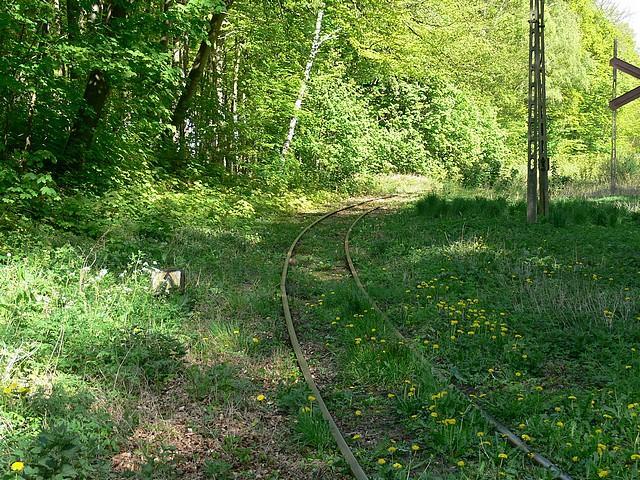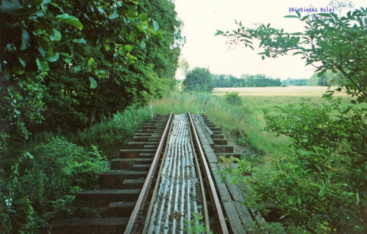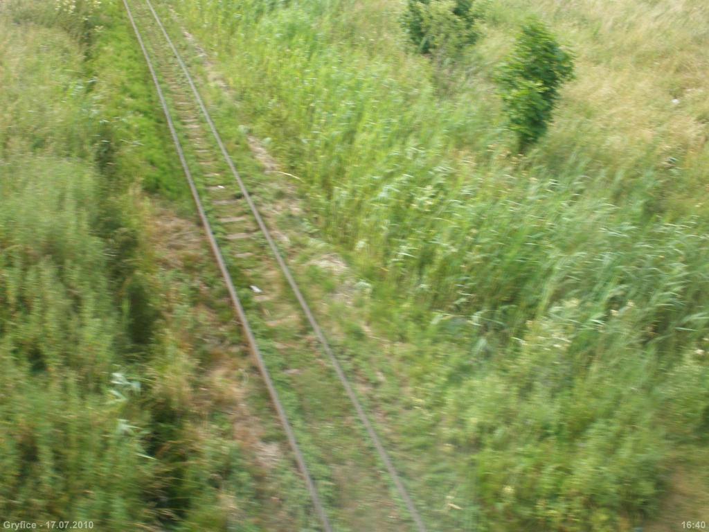 Tor wąskotorowy 1000 mm prowadzący z wiaduktu z linią normalnotorową Szczecin - Świnoujście w kierunku Łożnicy.