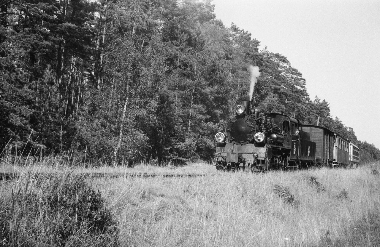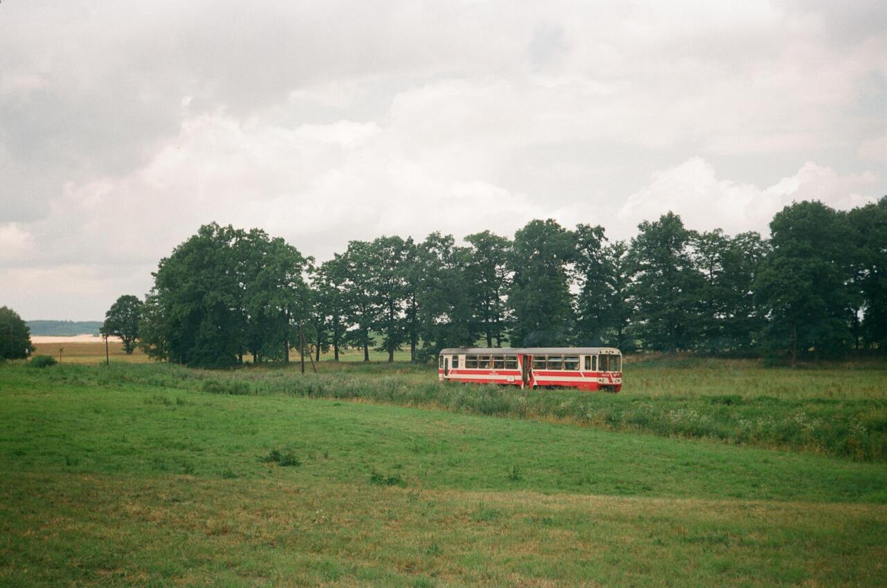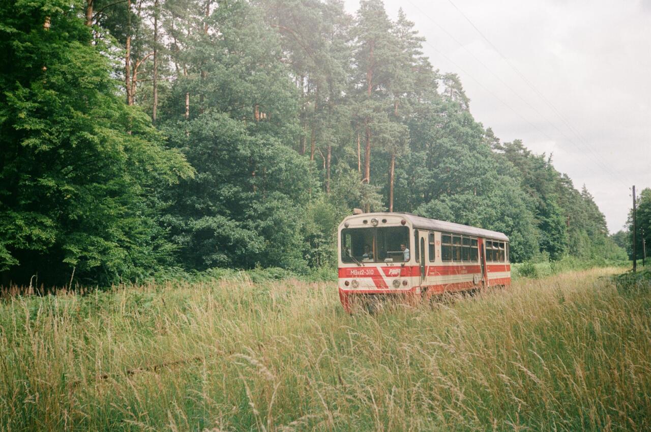Odcinek Trzechel - Żychlikowo: pociąg MM 23 relacji Gryfice Wąskotorowe - Łoźnica Wąskotorowa, obsługiwany wagonem spalinowym MBxd2-310. Widok w kierunku stacji Gryfice Wąskotorowe.