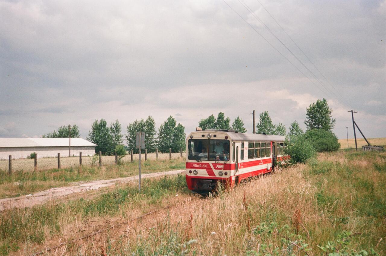 Odcinek Kołomąc - Świeszewo: pociąg MM 23 relacji Gryfice Wąskotorowe - Łoźnica Wąskotorowa, obsługiwany wagonem spalinowym MBxd2-310 zbliża się do przystanku osobowego Świeszewo. Widok w kierunku stacji Gryfice Wąskotorowe.