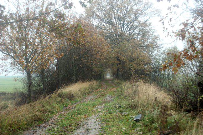 Odc. Gadom - Samlino Odg. w miejscu wąwozu, żółty szlak PTTK, droga nieprzejezdna (dostępna obok droga na polu rolnym po prawej);
