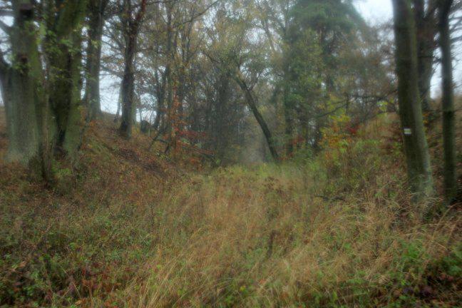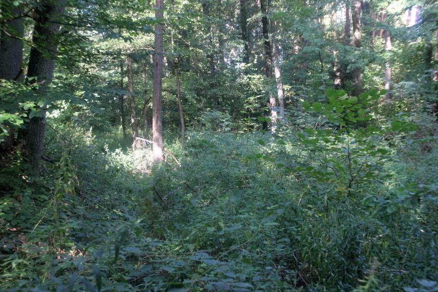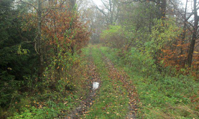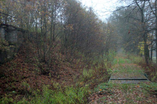 Fragment torów porośnięty przez drzewa, po stronie południowej od linii normalnotorowej, widok w stronę Samlina Odg.;