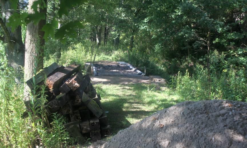Most na dawnej linii wąskotorowej, zastępujący stary most widoczny na zdjęciu z 2013-11-02, widoczny rozstaw podpór fundamentowych odpowiedni do rozstawu szyn;