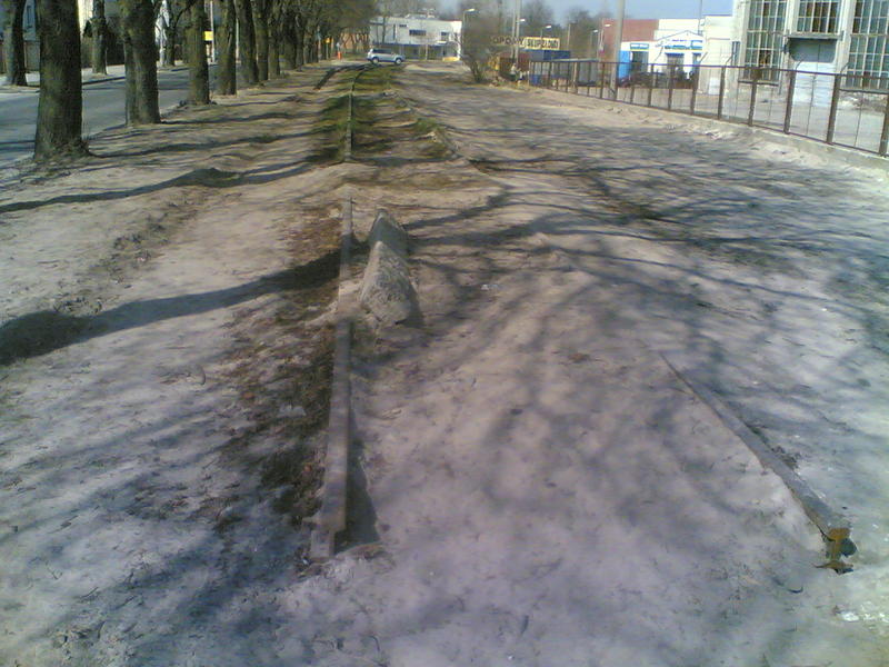 Braki w torowisku. Kilkusetmetrowy odcinek torowiska przy ul. św. Józefa rozebrano, aby stworzyć miejsce dla wjazdu samochodów na teren budowy nowego osiedla. Widok w kier. Czarnowa.