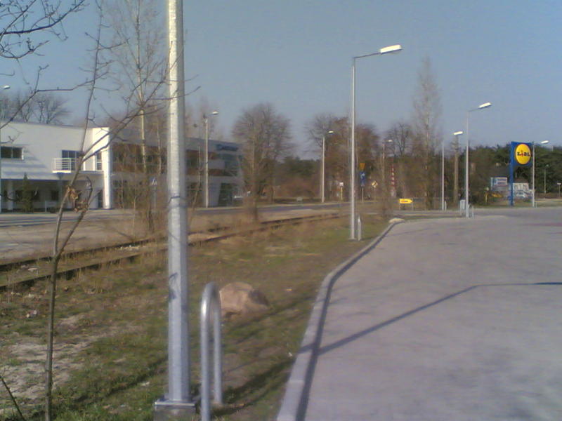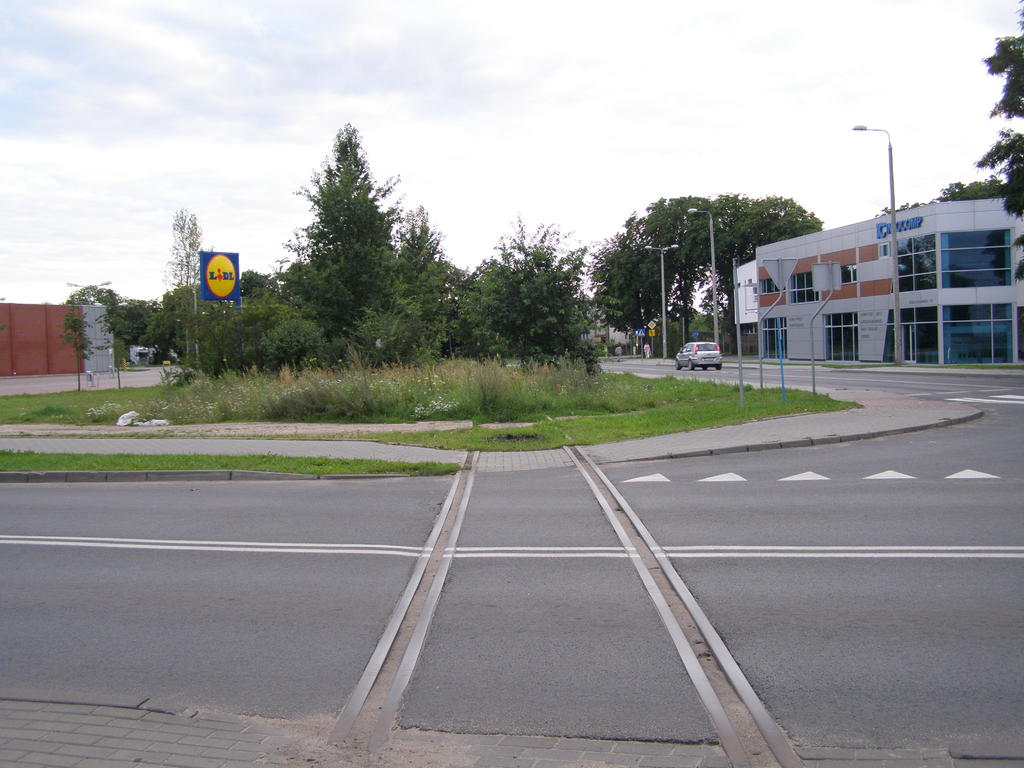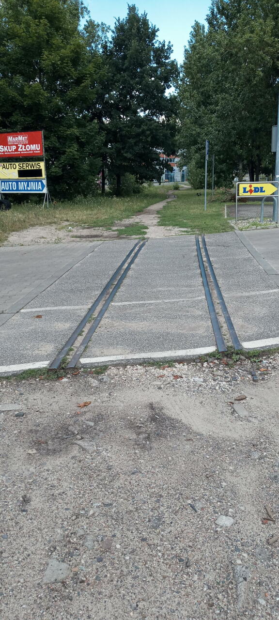 Pozostałość linii do Czarnowa na przejeździe przy Lidlu. Wjazd na parking sklepowy. Widok w kierunku Czarnowa.