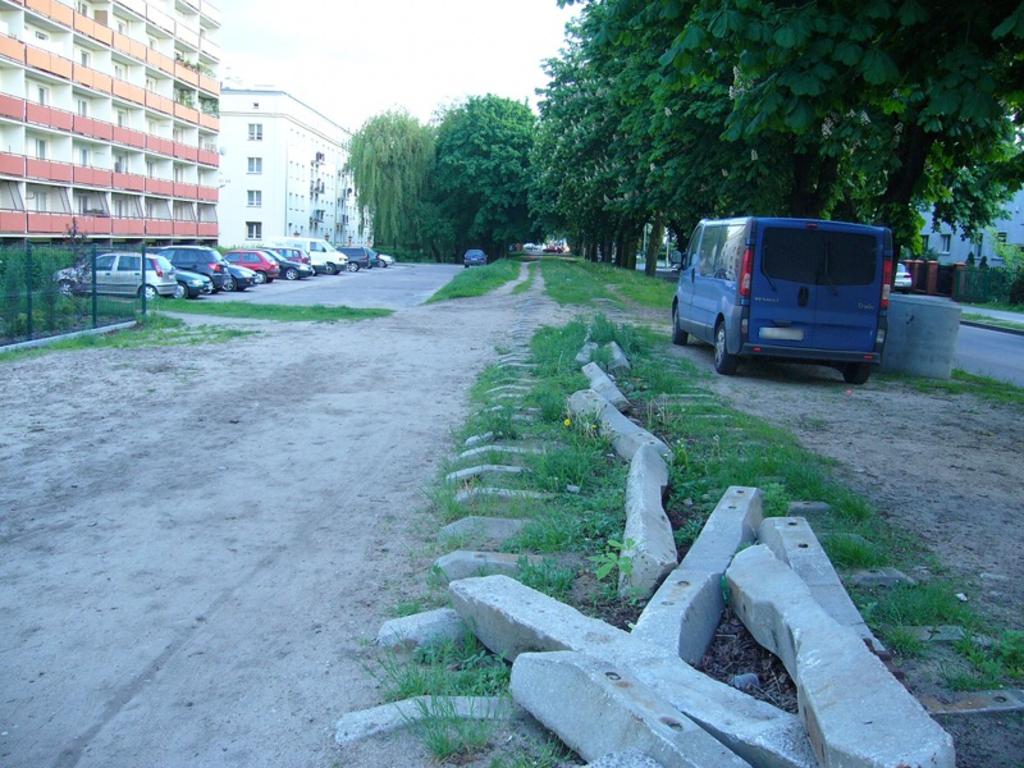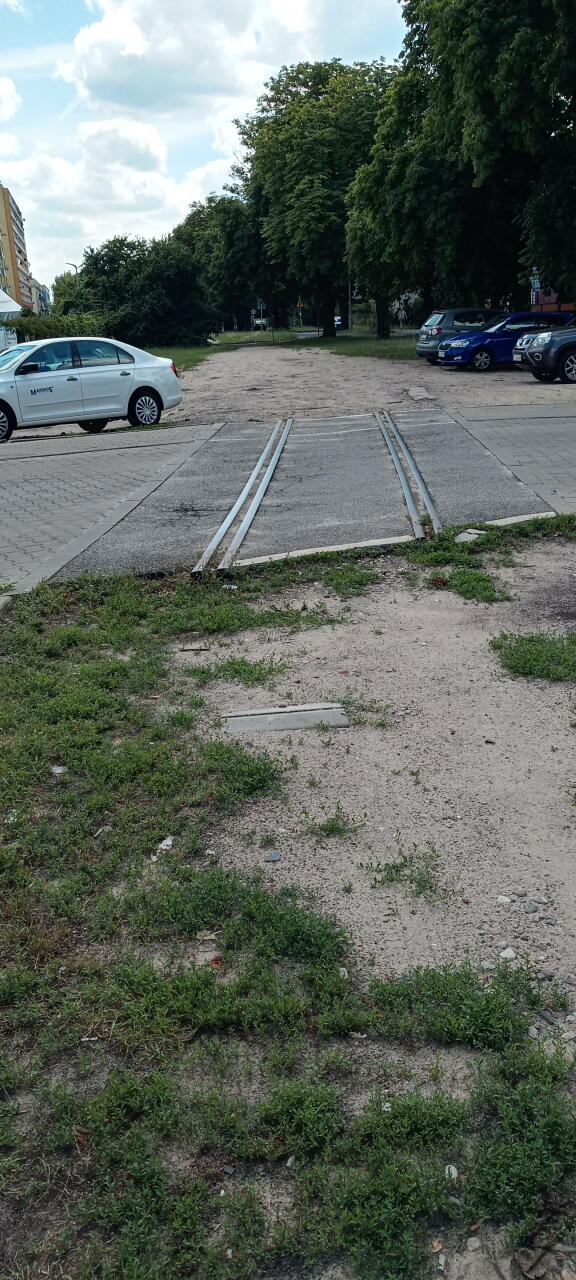 Miejsce starotorza koło Lidla przy dworcu północnym. Widok w kierunku Torunia Zachodniego/ Czarnowa. W tle pozostałość toru w dawnym przejeździe. Wjazd na parking sklepu.