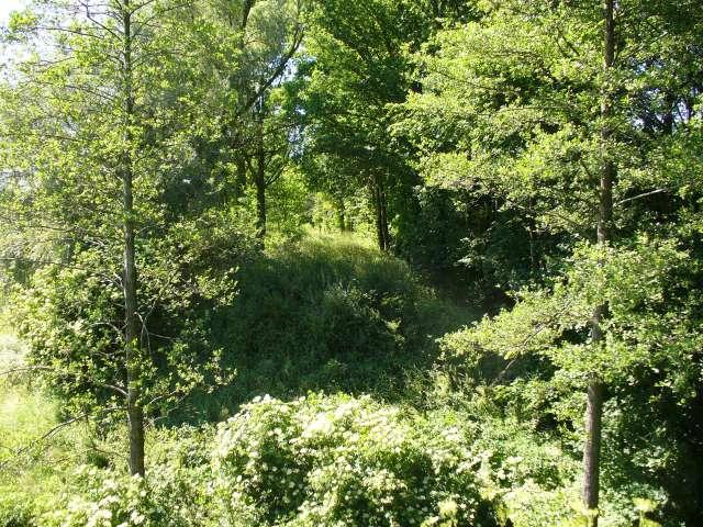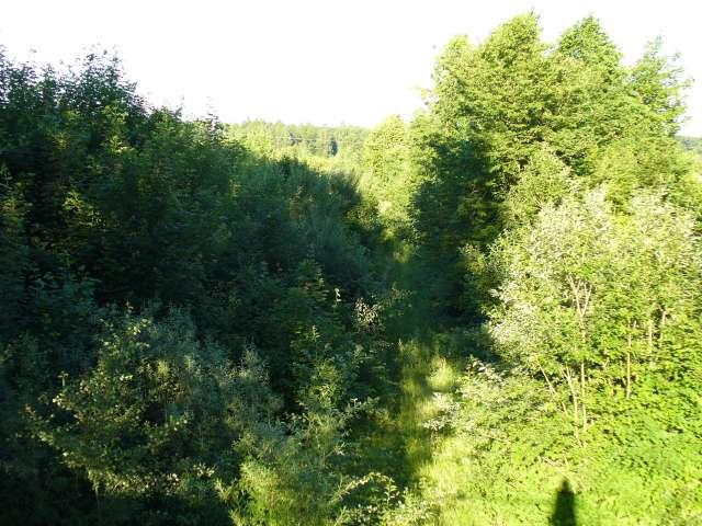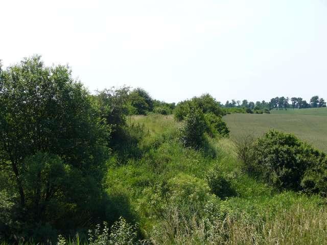 Wyrwa w nasypie przez którą przepływa strumyk, który jest dopływem rzeczki Miłosnej. Widok w kierunku Krzykos.